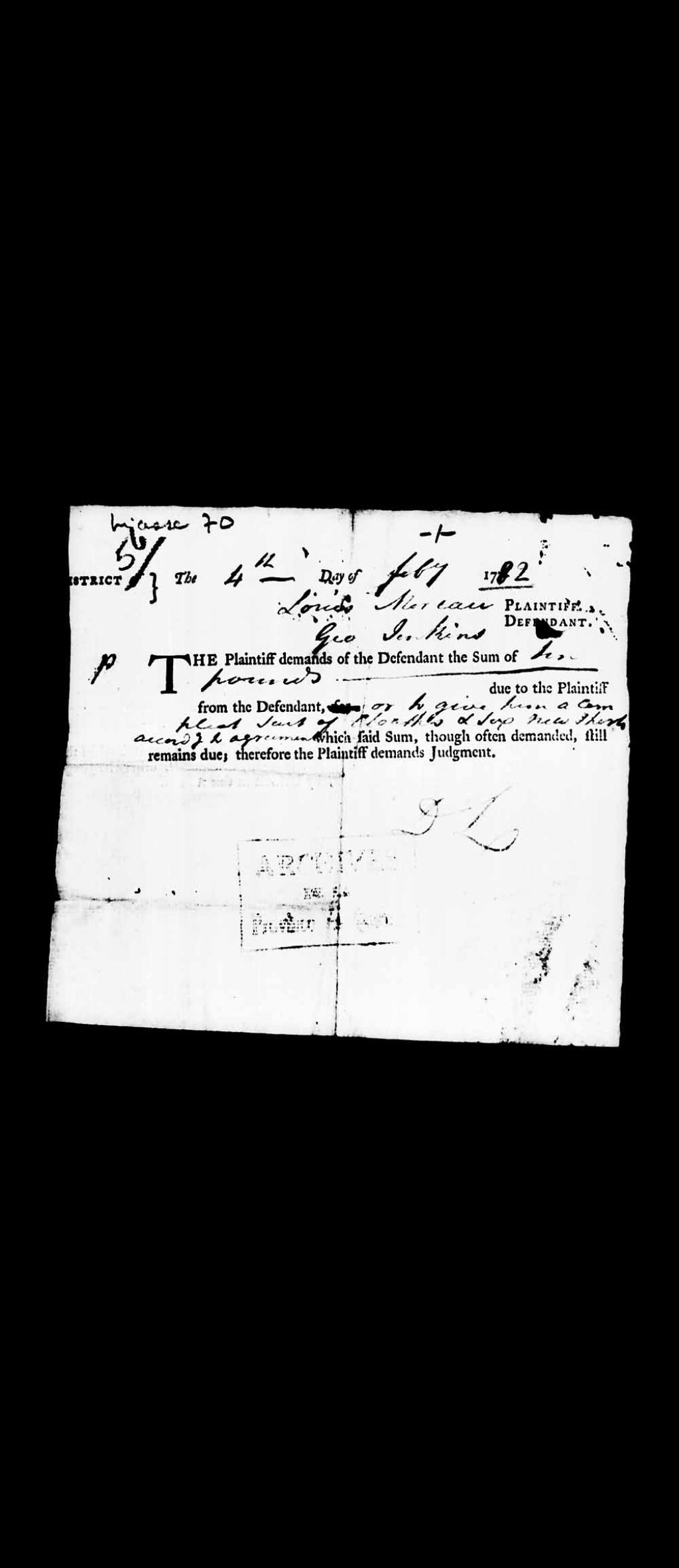 Sommation dans la cause de Louis Moreau, demandeur, contre George Jenkins, défendeur, pour la somme de 10 livres; l'audience se tiendra à la Chambre de la Cour dans la ville de Québec, devant le juge P. Panet, 4 février 1782, Archives nationales à Québec, Collection Pièces judiciaires et notariales, (03Q,TL5,D70056).