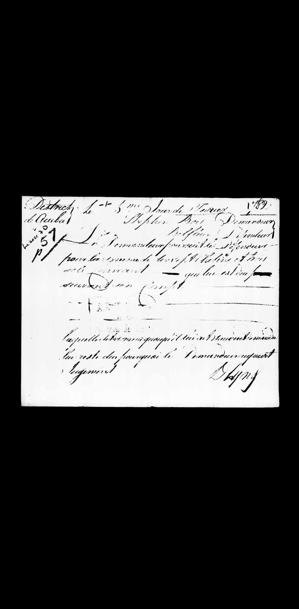 Sommation dans la cause de Stephen Bois, demandeur, contre monsieur Belfleur (Bellefleur), défendeur, pour la somme de 17 shillings et 3 sols; l'audience se tiendra à la Chambre de la Cour dans la ville de Québec, devant le juge P. Panet, 5 février 1782, Archives nationales à Québec, Collection Pièces judiciaires et notariales, (03Q,TL5,D70057).