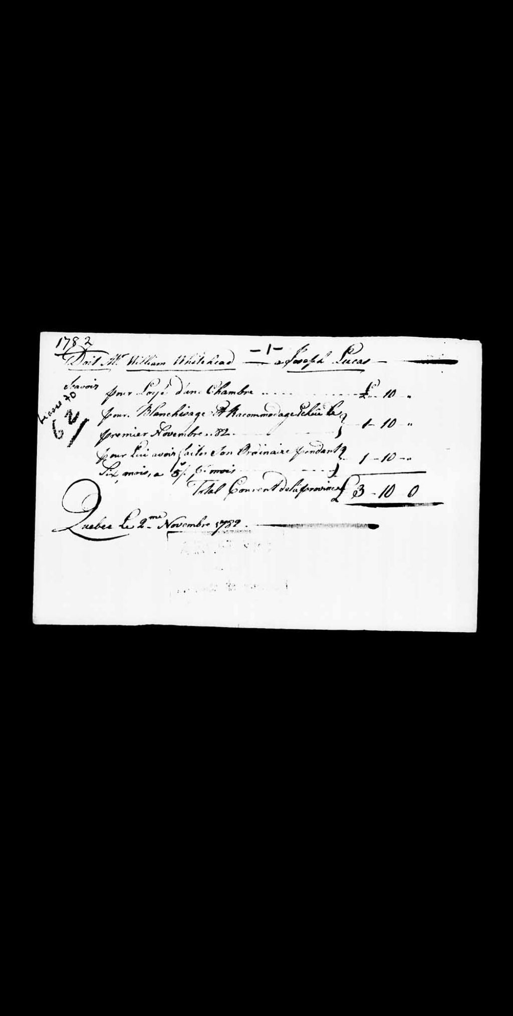 Compte et balance de Joseph Lucas à William Whitehead, pour le loyer d'une chambre, le blanchissage et le racommodage, 2 novembre 1782, Archives nationales à Québec, Collection Pièces judiciaires et notariales, (03Q,TL5,D70062).