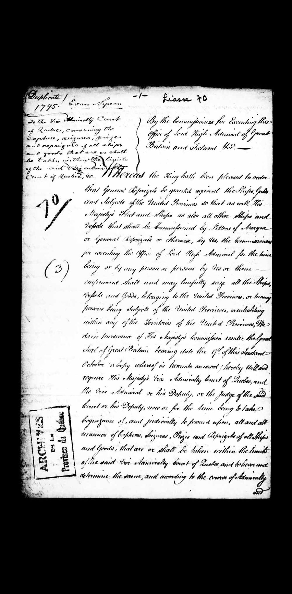 Lettre de Evan Napean à l'Amirauté de Québec, à propos de la capture et du rapatriement de tous les bateaux et marchandises qui seront pris dans les limites de ladite Amirauté, 16 octobre 1795, Archives nationales à Québec, Collection Pièces judiciaires et notariales, (03Q,TL5,D70070).