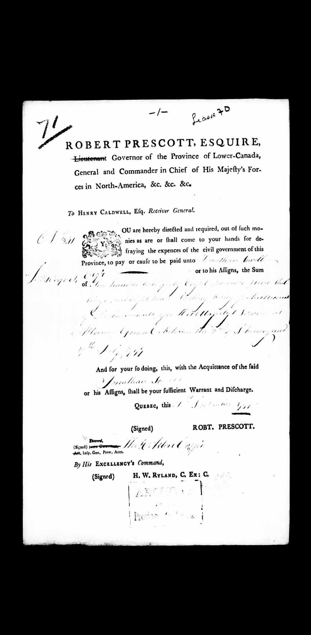 Autorisation du gouverneur Robert Prescott, gouverneur du Bas-Canada, adressé au receveur général, Henry Caldwell, de payer à John Sewell, écuyer, la somme de £ 248.9.8 sterling, pour le service de Sa Majesté, comme procureur général, Henry Caldwell, entre le 2 février et 17 juillet 1797, 14 septembre 1797, Archives nationales à Québec, Collection Pièces judiciaires et notariales, (03Q,TL5,D70071).