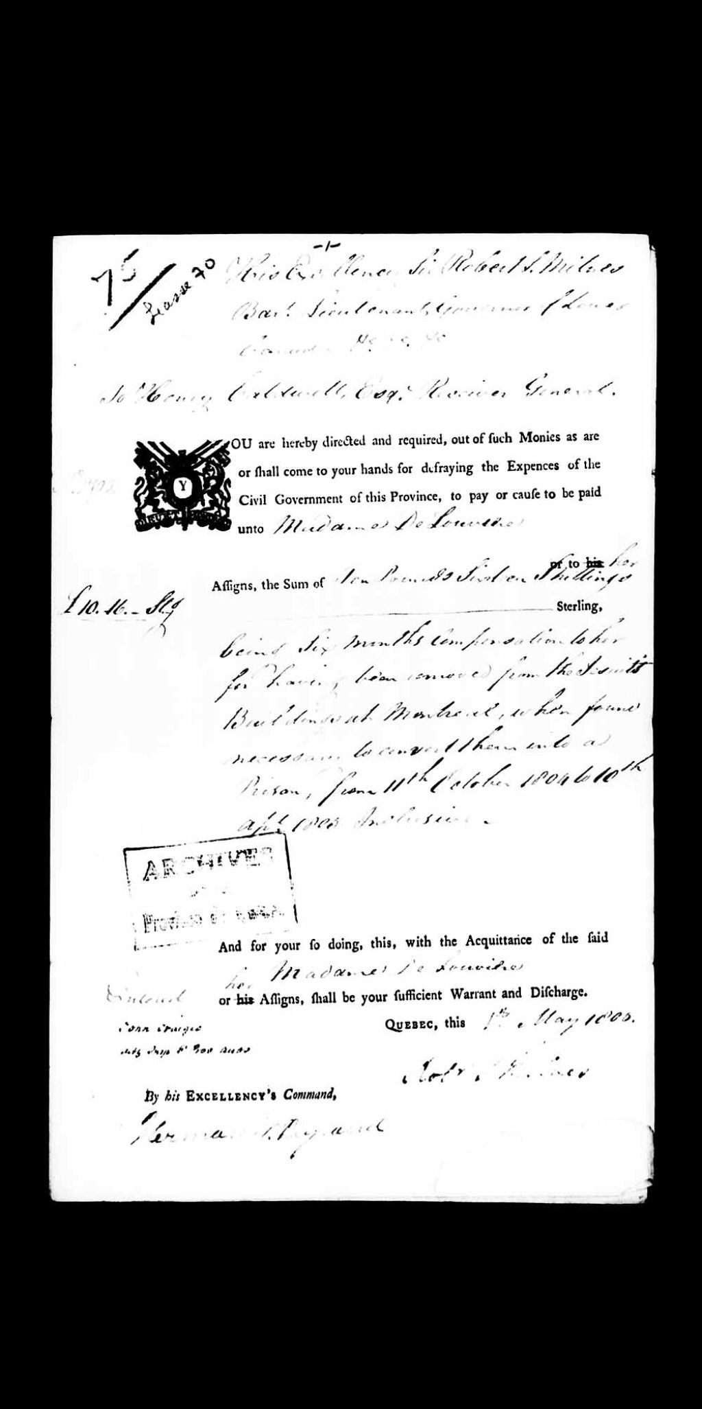 Autorisation du lieutenant gouverneur du Bas-Canada, Robert Shore Milnes, adressée au receveur général, Henry Caldwell, de régler la réclamation de madame De Louvière, de la somme de £ 10.16 sterling