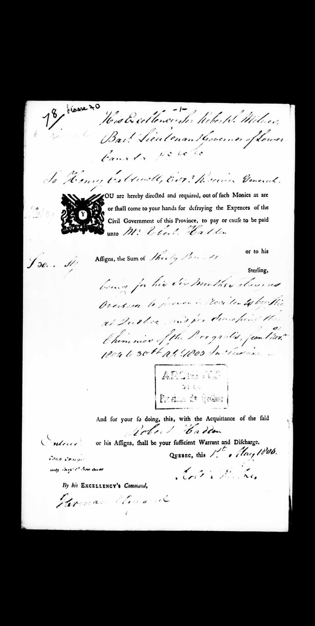 Autorisation du lieutenant gouverneur du Bas-Canada, Robert Shore Milnes, adressée au receveur général, Henry Caldwell, de payer à Robert Hadden, la somme de £ 30.0.0 pour son salaire mensuel pour avoir prévenu les accidents par le feu et pour avoir ramoné les cheminées des pauvres gratuitement, 1er mai 1805, Archives nationales à Québec, Collection Pièces judiciaires et notariales, (03Q,TL5,D70078).