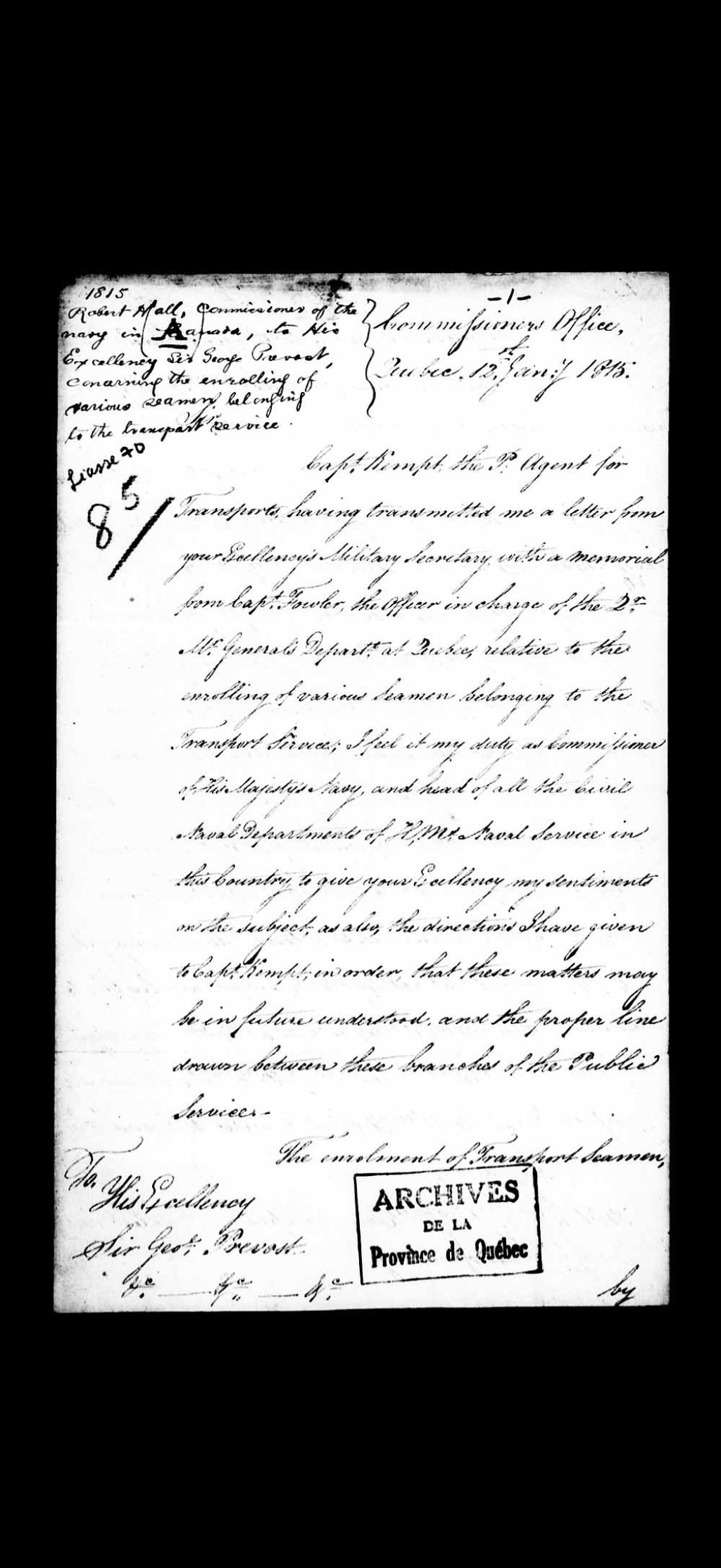 - Lettre de Robert Hall, commissaire de la Marine au Canada, adressé à Son Excellence Sir Georges Prévost, concernant l'enrôlement de plusieurs marins appartenant au service des transports