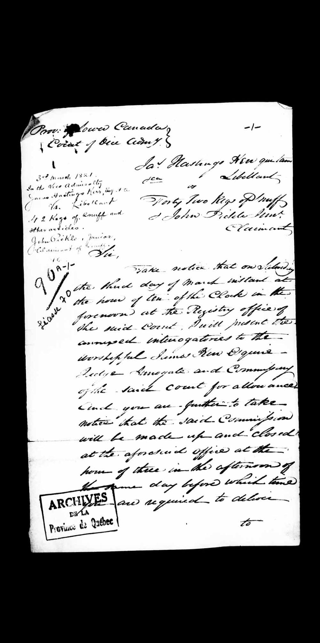 Procès à la Cour de la Vice-Amirauté, entre James Hasting Kerr, demandeur, à propos de 42 tonnelets de tabac (kegs of snuff) et autres articles, contre John Pickle, junior, défendeur
