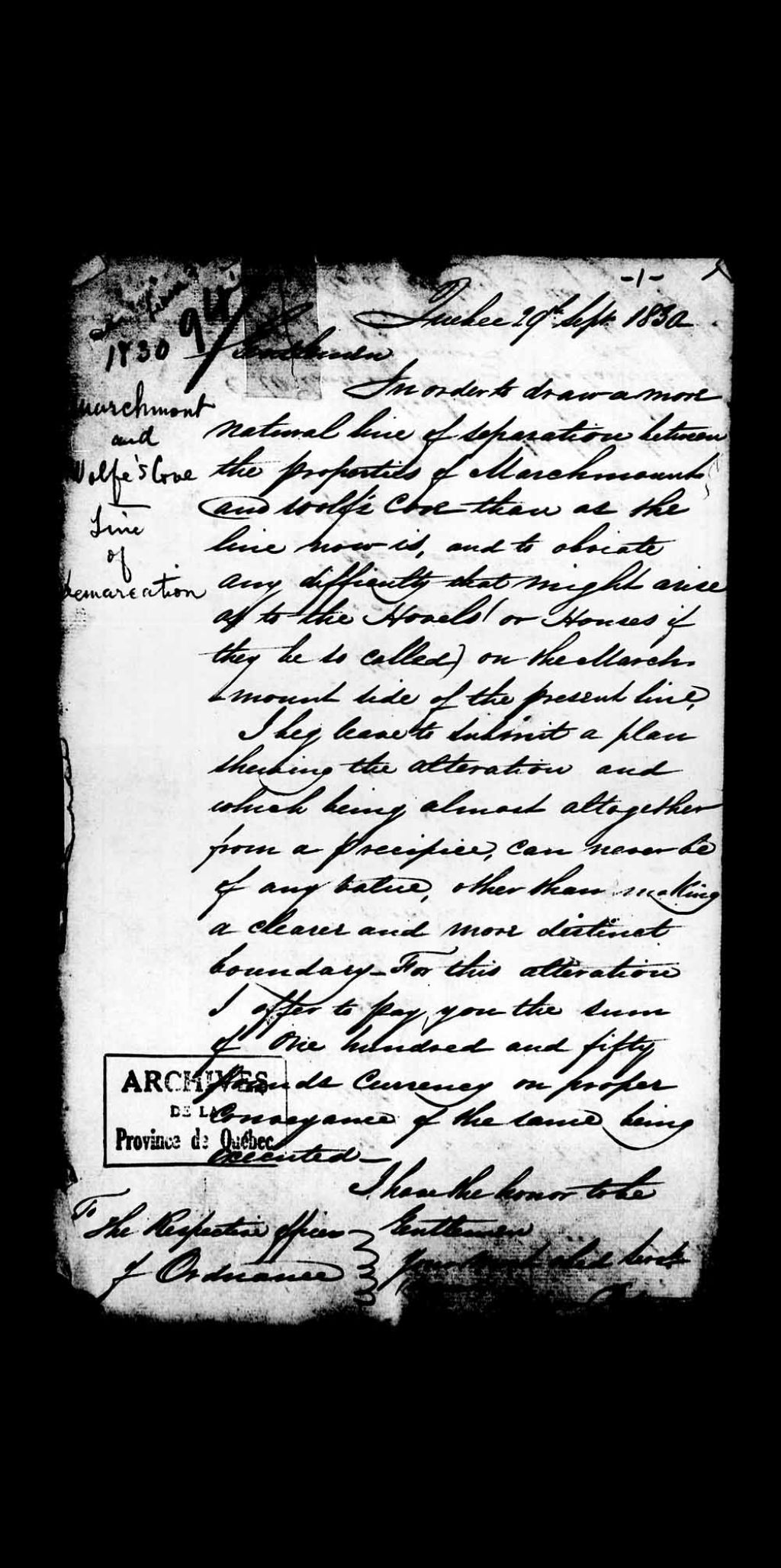 - Correspondances entre Andrew Patterson, Richand Penn et R. Byhaut, esquire, Allan Gilmour et les «Respectiac officers of Ordinance», à propos de la ligne de démarcation entre Marchmont et l'Anse Wolfe, présentées comme «exhibit» dans le cadre du procès à la Cour du Banc du Roi, entre Gilmour et Longhren, enregistré le 4 octobre 1836