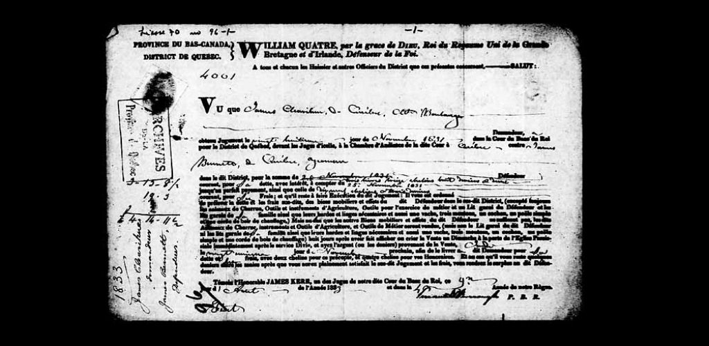 Signification du jugement rendu le 28 novembre 1831 à la Cour du Banc du Roi, entre James Clearihue, boulanger de Québec, demandeur James Bennett, défendeur, 9 août 1833, Archives nationales à Québec, Collection Pièces judiciaires et notariales, (03Q,TL5,D70096).