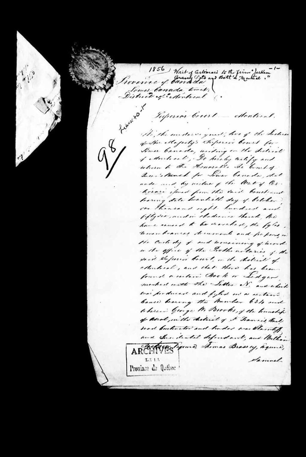 Exploit d'assignation (writ of certiorari) à William Jackson, esquire (écuyer), Thomas Brassey, esquire, Samuel Martin Peto, esquire et Edward Ladd Betts, esquire, tous de la ville de Londres, en Angleterre, marchands et «railroad contractors», faissant affaire tant en la ville de Québec et Montréal, que dans les districts de Trois-Rivières et Saint-François, dans la Province du Canada, sous le nom de firme «Jackson Brassey Peto et Betts», ayant leurs bureau à Montréal, afin qu'ils comparaissent devant les juges de la Cour supérieur du Bas-Canada, au District de Montréal, sur la plainte de George Brooks, du Township d'Ascot, dans le District de Saint-François (St. Francis), contractant en chemins de fer (railroad contractor and trader)