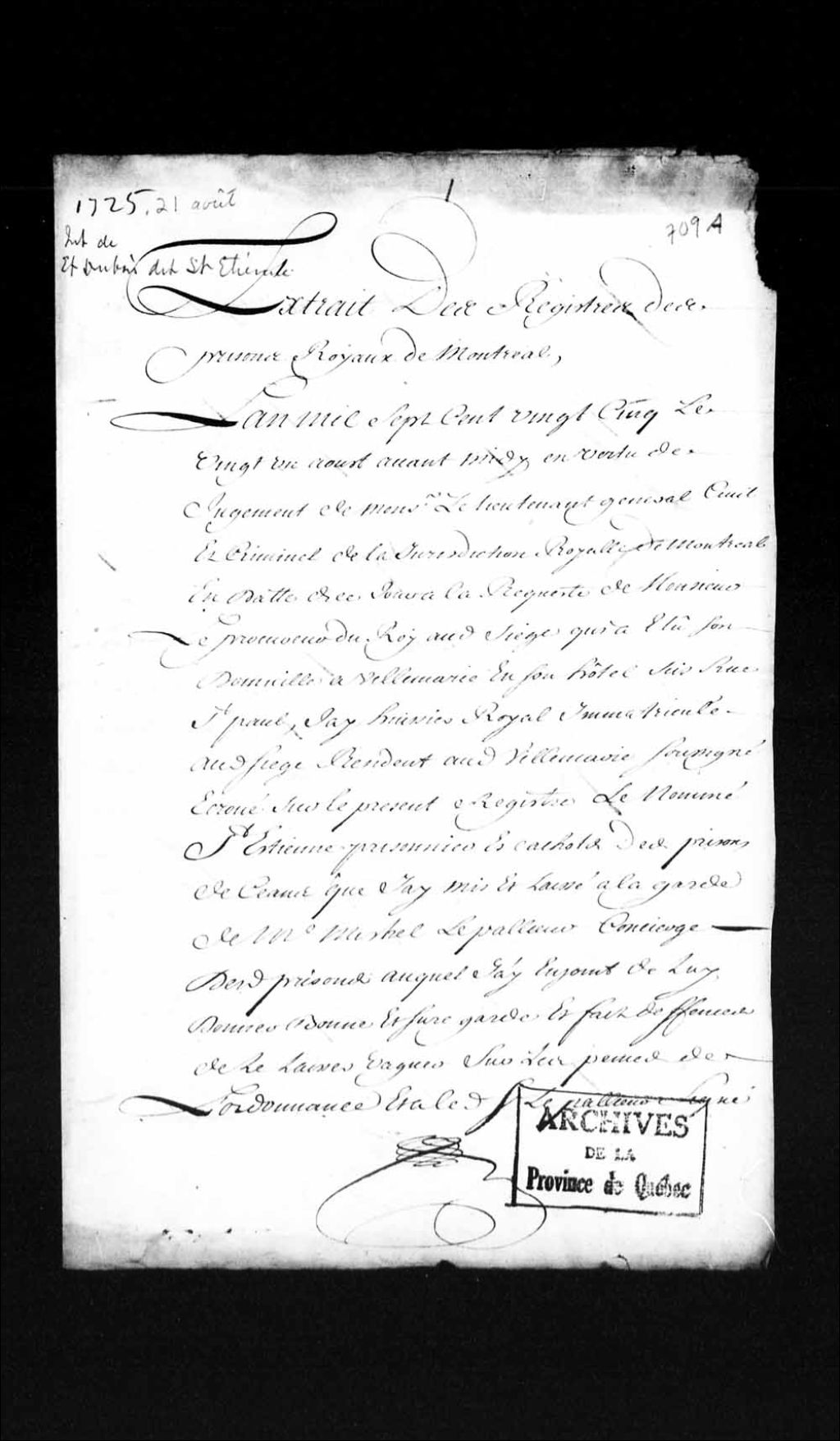 - Procédures criminelles contre Étienne Dubois dit Saint-Étienne, âgé de 29 ans, manoeuvrier de son métier, demeurant à Montréal, pour avoir été trouvé nuitamment dans le grenier du sieur Langlois, bourgeois de Montréal, et accusé d'avoir volé une peau de castor dans le grenier du sieur Parent fils