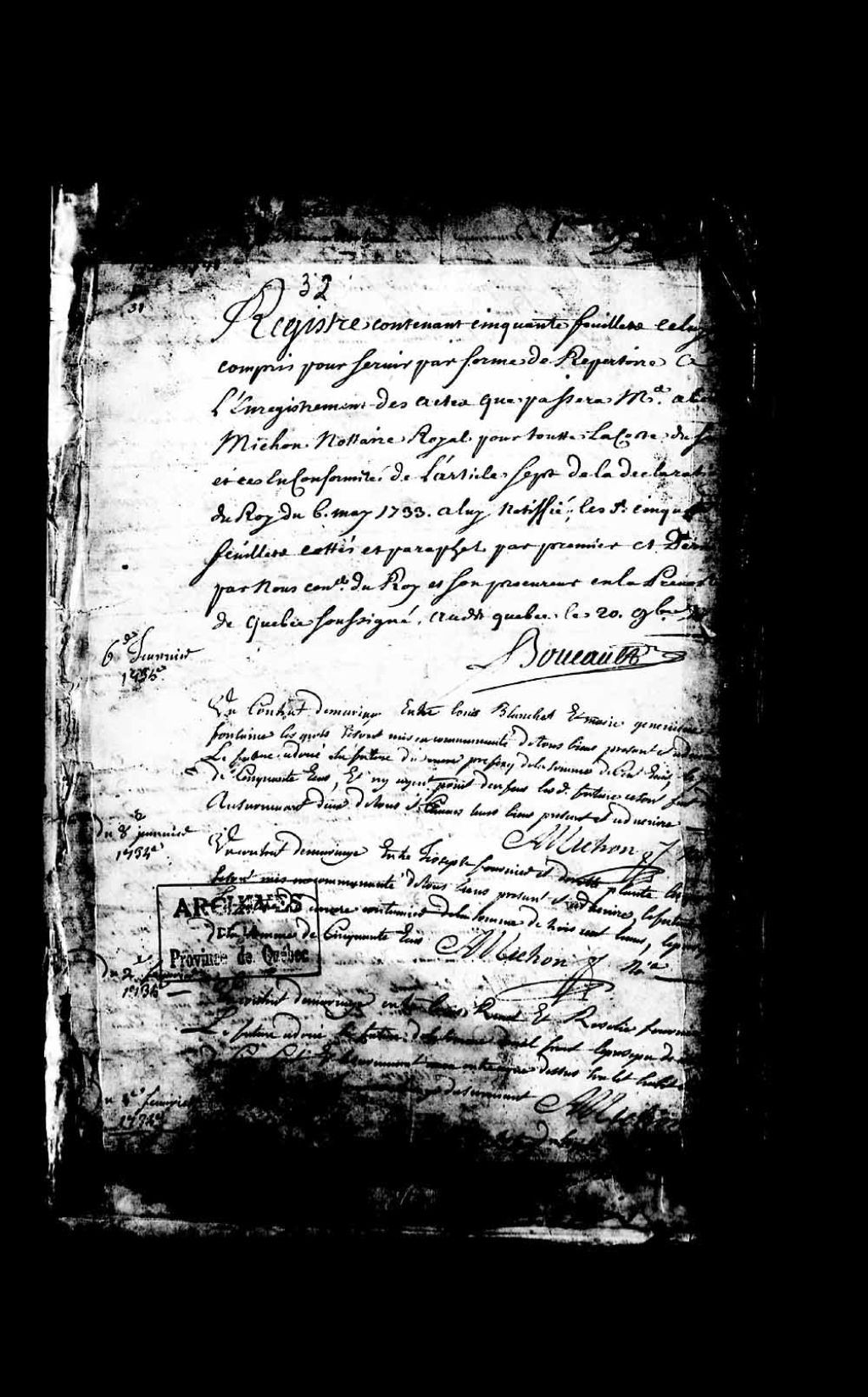 Répertoire des actes passés par Abel Michon, notaire royal pour la Côte du Sud (Montmagny), entre le 6 janvier 1735 et le 24 janvier 1748; répertoire fait en conformité de l'article 7 de la déclaration du Roi, du 6 mai 1733 et paraphé au premier et dernier feuillet par le procureur de la Prévôté de Québec, Boucault, le 20 novembre 1734