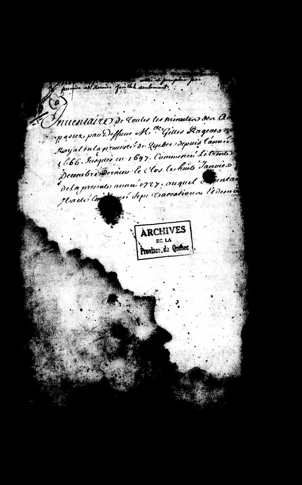 Inventaire et procès-verbal de l'inventaire des minutes de Gilles Rageot, notaire royal en la Prévôté de Québec, entre le 11 novembre 1666 et le 18 décembre 1699, faits par Pierre André de Leigne, lieutenant général civil et criminel de la Prévôté de Québec et par Louis-Guillaume Verrier, procureur général du Roi, au Conseil supérieur de Québec et commissaire nommé par arrêt du Conseil d'État du Roi, le 25 mars 1730, pour le dépouillement des minutes des notaires présentement en charge ou décédés, dans l'étendue de la Prévôté de Québec