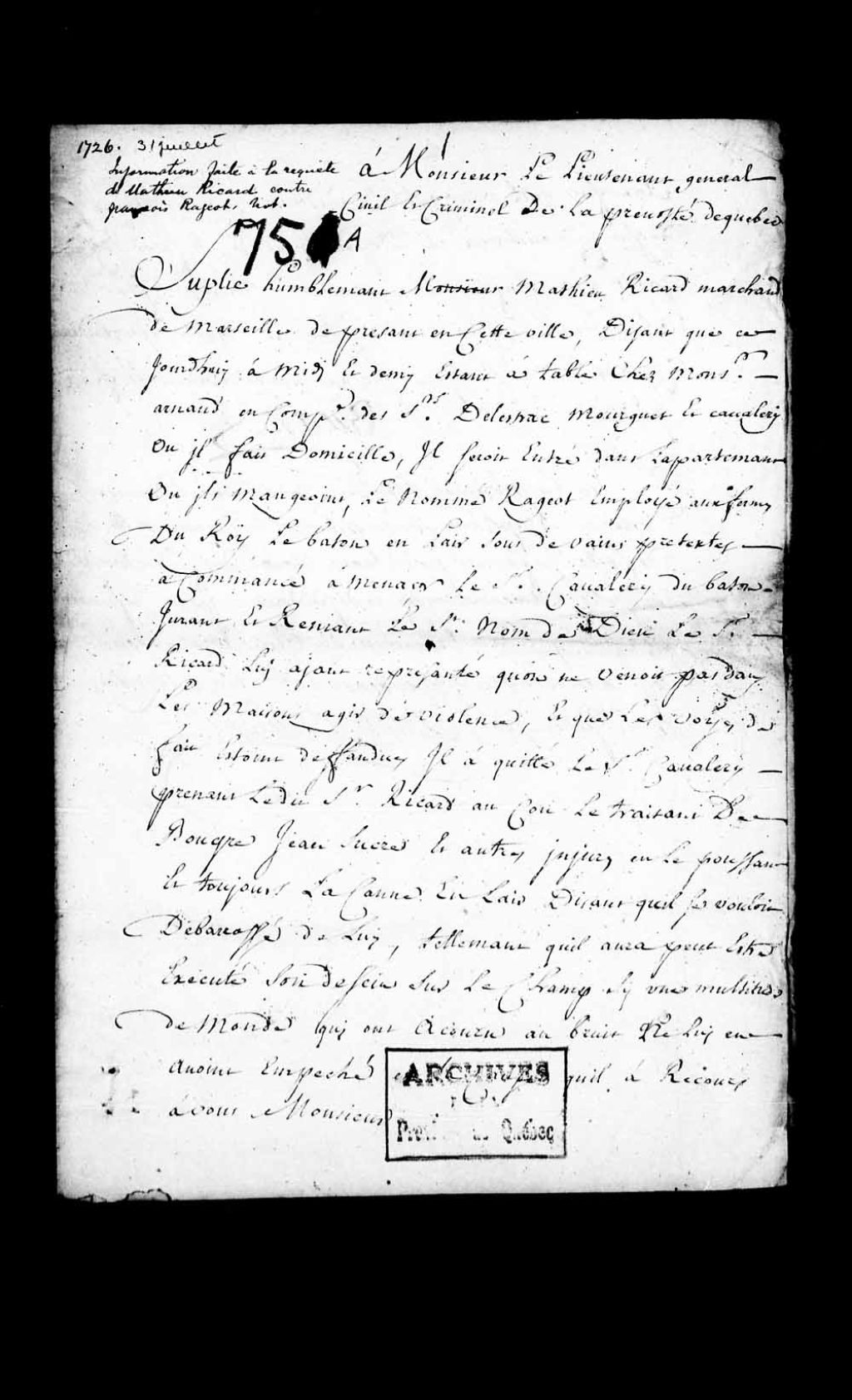 Information faite à la requête de Mathieu Ricard, marchand forain de Marseille, de présent à Québec, contre François Rageot, garde à la conservation des droits du domaine du Roi, employé à la Ferme du Roi, accusé d'avoir assailli ledit Ricard à coups de bâton