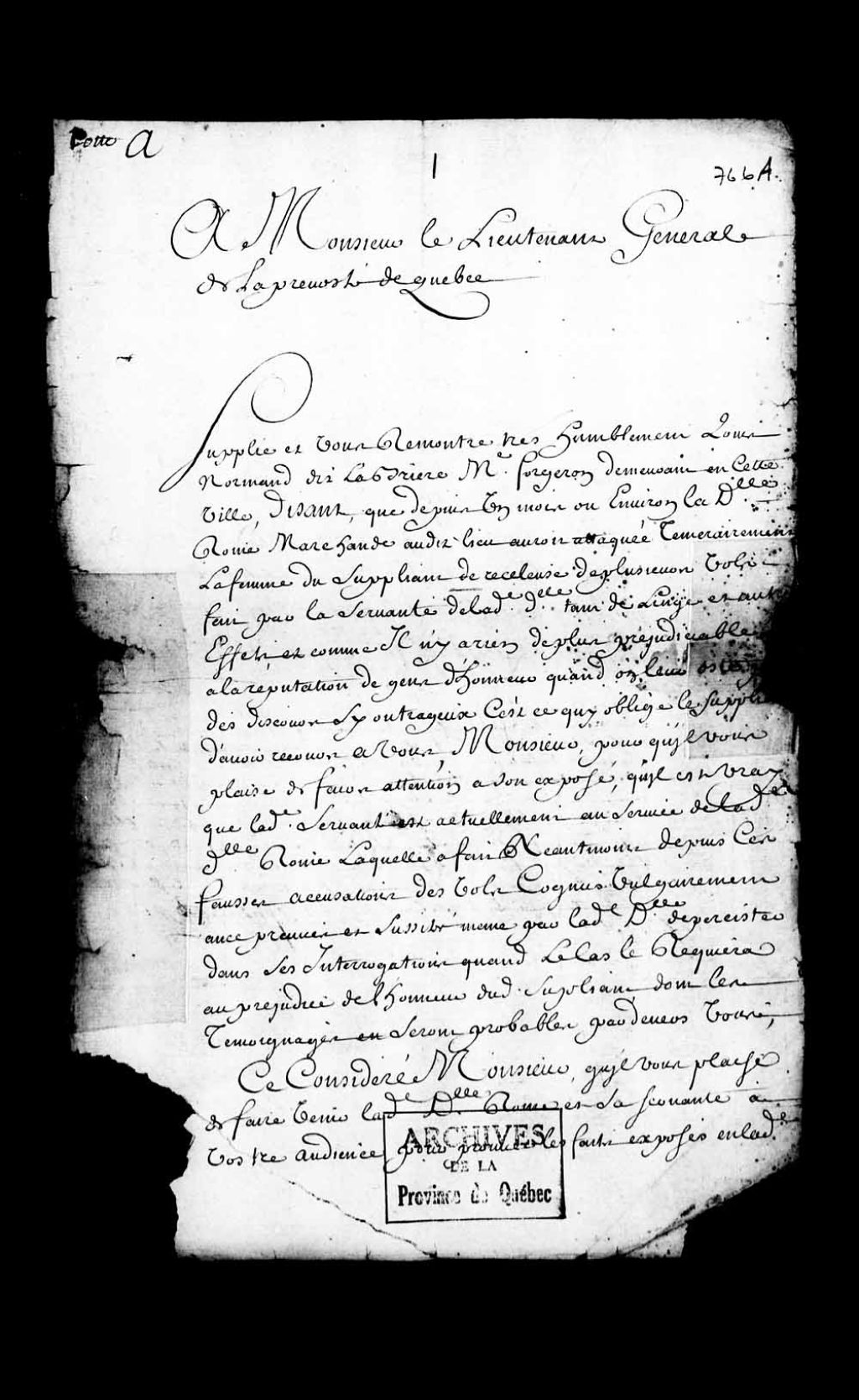 Ce dossier comprend des exploits d'assignation, un inventaire des pièces du procès; un mémoire des sommes dues par Marie Larose; une sentence rendue en la Prévôté de Québec, ordonnant l'élargissement et la mise hors de prison desdites Jarry, Brunet et Larose; un réquisitoire du procureur du Roi; les confrontations des accusées aux témoins; le récolement des accusées pour leur interrogatoire; une confrontation des accusées entre elles; le récolement de la veuve Rommes dans son interrogatoire; une ordonnance de récolement des accusées; des ordonnances pour l'assignation des témoins; une ordonnance des récolement des témoins; le récolement des témoins en leurs dépositions; l'interrogatoire de la veuve de Rommes; une ordonnance de prise de corps contre lesdites Larose et Brunet; un procès-verbal d'écrou des accusées; l'information des témoins; l'acte de désistement de la veuve Rommes; une procuration de Louis Normand LaBrière à sa femme; l'interrogatoire de Anne Brunet et de Marie Larose; une ordonnance pour l'écrou des trois accusées; un mémoire des effets volés par ladite Larose et remis à ladite Brunet; une requête de Louis normand pour la réparation de l'honneur de sa femme, accusée de recel . Ce dossier en matières criminelles provient de la Prévôté de Québec et comporte les témoignages ou dépositions des personnes suivantes : Marie-Madeleine Trépanier, veuve de Robert Voyer, âgée de 67 ans, demeurant à Québec, paroisse Notre-Dame; Louis Parent, navigateur et maître de barque, demeurant à Québec, paroisse Notre-Dame, âgé de 30 ans; Jean-Jérémy Defouet, sergent d'une compagnie du détachement de la Marine, demeurant à Québec, paroisse Notre-Dame, âgé de 27 ans; Guillaume Lemelin, navigateur, demeurant à québec, rue Champlain, paroisse notre-Dame, âgé de 44 ans; Pierre-Joseph Bernard, écrivain du Roi, âgé de 26 ans, demeurant à Québec, paroisse Notre-Dame; Pierre Frontigny, greffier de la Maréchaussée; demeurant à Québec, rue Saint-Pierre, paroisse Notre-Dame, âgé de 43 ans