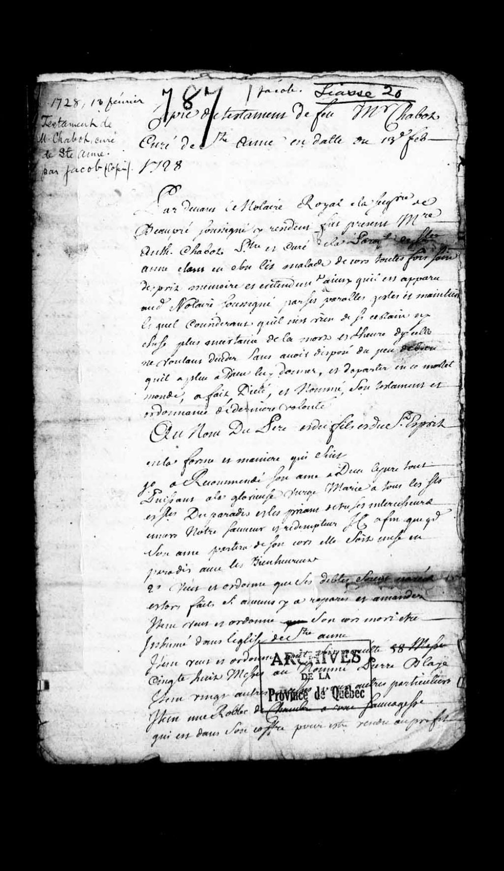 Testament de Messire Antoine Chabot, curé de la paroisse de Sainte-Anne de Beaupré