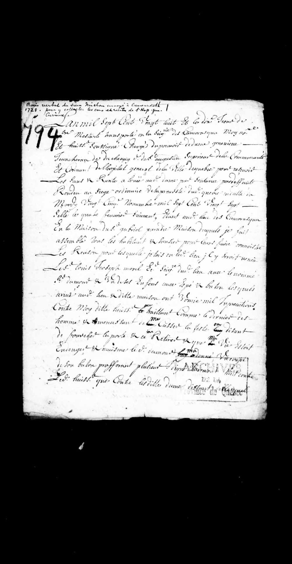 Procès-verbal du sieur Michon, huissier et notaire, envoyé à Kamouraska par Geneviève Juchereau de Duchesnay dite dame Saint-Augustin, supérieure de la communauté et du couvent de l'Hôpital-Général de Québec, pour y percevoir les cens et rentes dus au seigneur Louis-Joseph Morel de Ladurantaye, mais accordés à l'Hôpital-Général par jugement de la Prévôté de Québec du 25 novembre 1727, 10 novembre 1728, Archives nationales à Québec, Collection Pièces judiciaires et notariales, (03Q,TL5,D794).