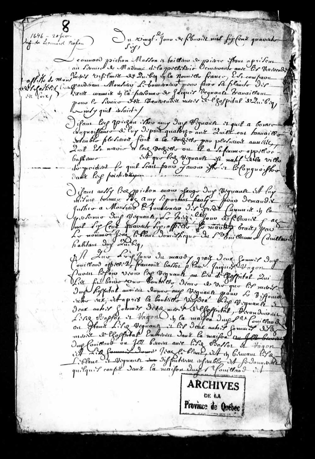 - Procédures criminelle faites à la requête de Léonard Pichon, maçon et tailleur de pierre, au service de madame de La Peltrie (Pelterie), demeurant avec les Révérendes Mères Ursulines, pour et au nom de son ami Jacques Regnault (Renaud), marié à La Rochelle à Bastienne (...), natif de Poitiers, travaillant pour les Mères de l'Hôpital de Québec (Hôtel-Dieu), contre un nommé Jean Leblanc, domestique du sieur Guillaume Couillard, pour assaut grave sur ledit Regnault le mardi gras d'auparavant, après avoir pris de l'eau-de-vie (alcool)
