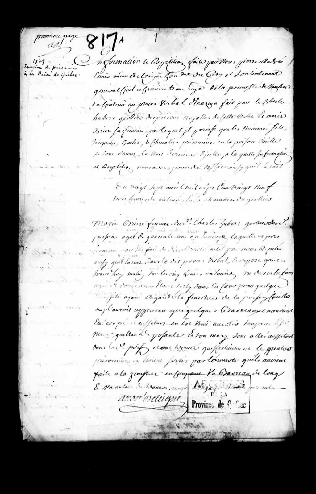 Enquête faite sur l'évasion de plusieurs prisonniers, notamment les nommés Filo, Goulet et Jean Chevalier, des prisons royales de la ville de Québec, 27 avril 1729 - 29 avril 1729, Archives nationales à Québec, Collection Pièces judiciaires et notariales, (03Q,TL5,D817).