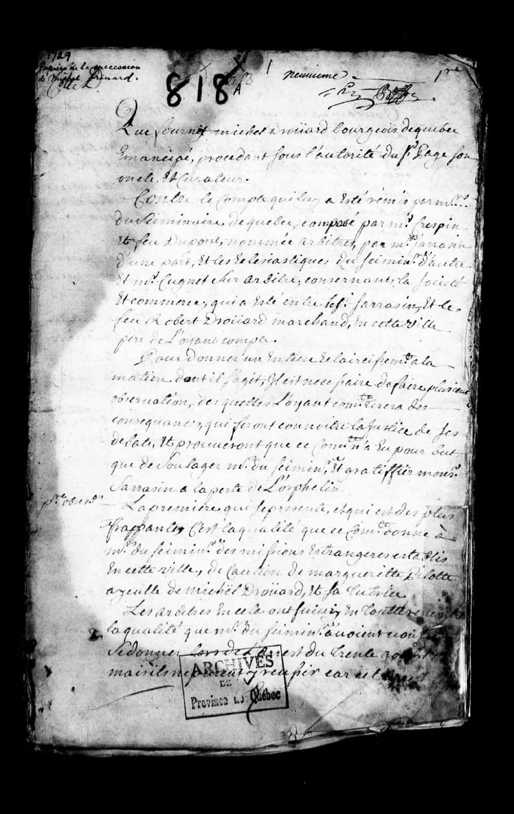 Procès entre Michel Drouard, marchand bourgeois de Québec, émancipé, fils héritier de Robert Drouard, contre Michel Sarrazin, conseiller, et Henri Hiché, tuteur de Florent Desguerrois Desrosiers, et les Sieurs Ecclésiastiques du séminaire de Québec, au nom et comme caution de Marguerite Pilote, aïeule et tutrice de Michel Drouard; relativement aux contestations touchant les intérêts de la société qui a été entre le dit feu Robert Drouard et le dit sieur Sarrazin, 17 décembre 1729 - 31 décembre 1729, Archives nationales à Québec, Collection Pièces judiciaires et notariales, (03Q,TL5,D818).