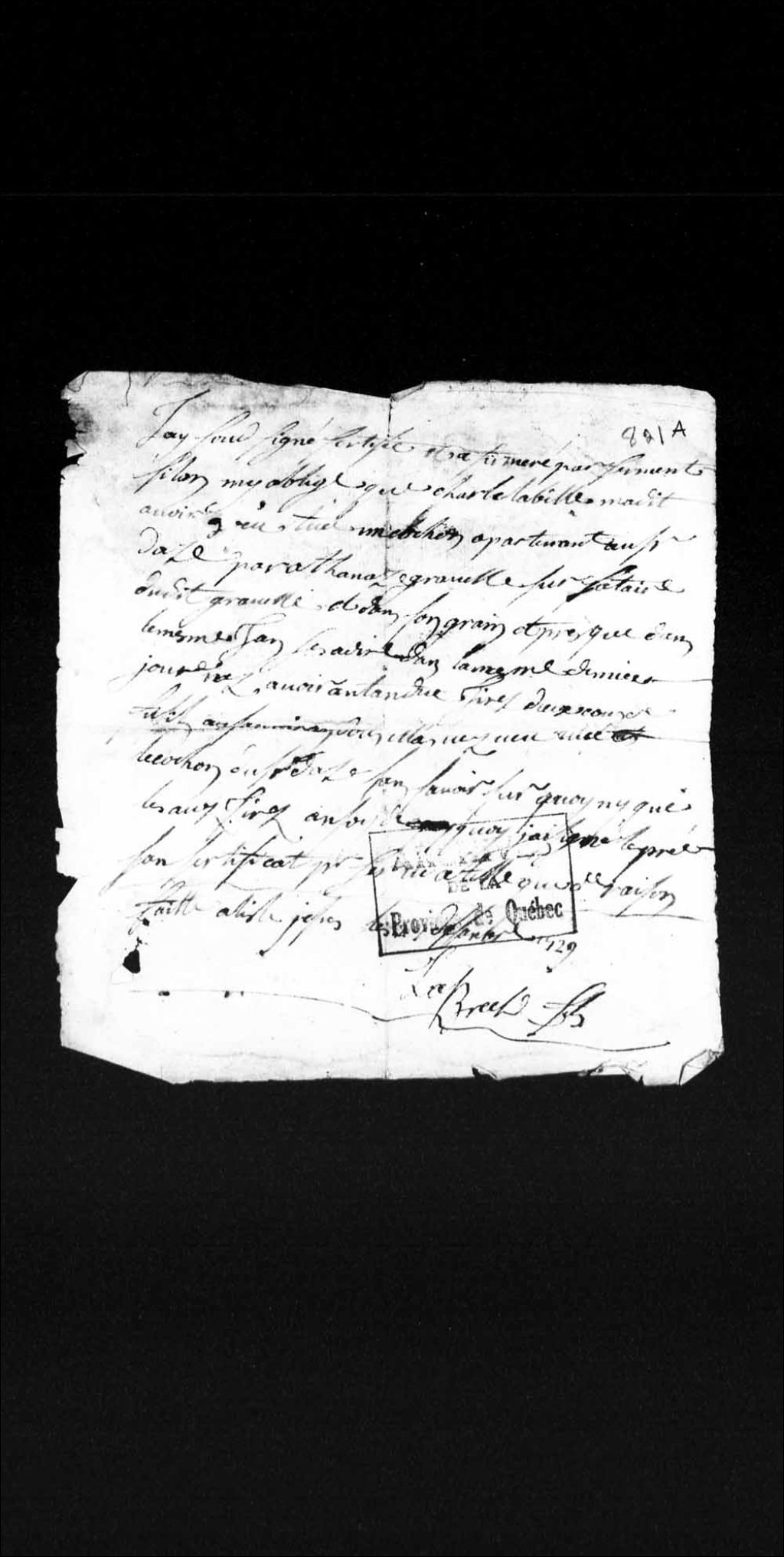 Procès entre Charles Dazé, habitant et capitaine de milice de l'île Jésus, et Athanase Gravel, habitant de l'île Jésus, accusé d'avoir tué trois cochons appartenant au sieur Dazé, 9 octobre 1729 - 7 mars 1730, Archives nationales à Québec, Collection Pièces judiciaires et notariales, (03Q,TL5,D821).