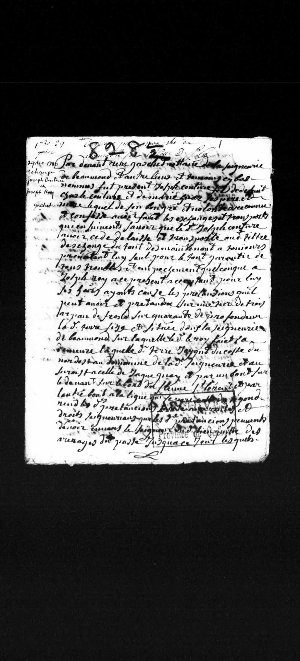 Donation des prétentions sur une terre située dans la seigneurie de Beaumont, et de biens meubles dépendants de la succession de feu Charles Couture, par Joseph Couture, fils issu du mariage entre feu Charles Couture et Marie Huard, à Joseph Roy