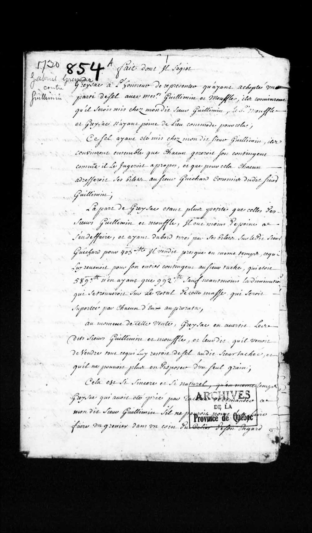 Procès de Gabriel Greysac, bourgeois et négociant de Québec, contre le sieur Guichard, commis de Charles Guillimin (Guillemin), comme chargé du sel acheté par les sieurs Greysac, Charles Guillimin et Moufle, au sujet d'une quantité de sel dont a disposé le sieur Moufle; ladite quantité appartenant au sieur Greysac et ayant été vendue au sieur Taché