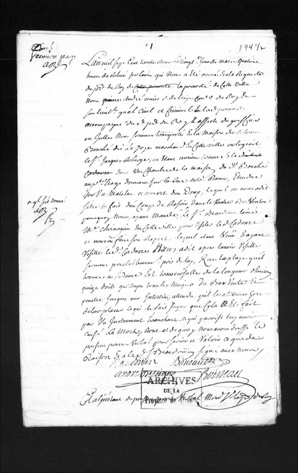 - Ce dosssier en matières criminelles provient de la Prévôté de Québec et du Conseil supérieur de Québec. Il comprend le procès-verbal de la visite du cadavre de Jacques Roberge, en la maison du sieur Louis Boucher, marchand de Québec, suivi de l'information des témoins; une requête présentée au Conseil supérieur de Québec, par François Clesse, curateur élu au cadavre de Jacques Roberge. Ce dossier contient les interrogatoires ou les dépositions des personnes suivantes : Louis Boucher dit Lajoie, marchand de Québec, demeurant rue et paroisse Notre-Dame, âgé de 25 ans; François Lemaître, Lamorille, marchand de Québec, juré arpenteur du Roi, demeurant en la Basse-Ville de Québec, paroisse Notre-Dame, âgé de 36 ans; Pierre-Marie Langlois, marchand de Québec, demeurant rue Sous-le-Fort, paroisse Notre-Dame, âgé de 37 ans; Marie-Geneviève Guignard, servante demeurant chez le sieur Lajoie, âgée de 16 ans