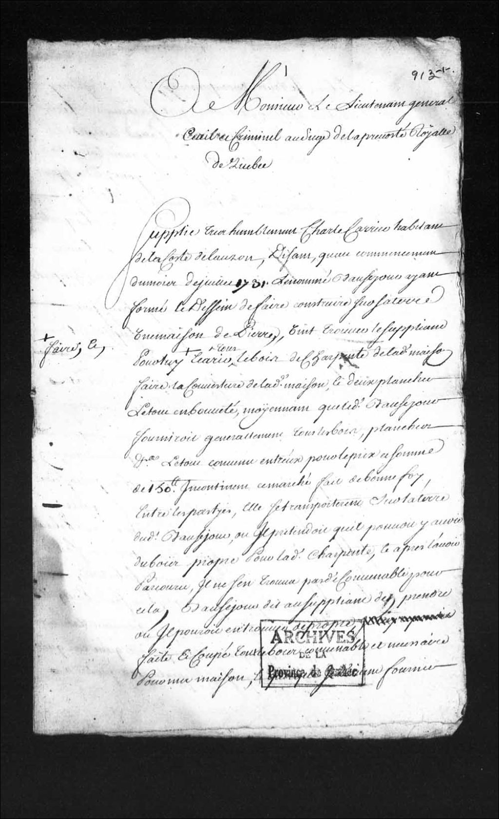 - Ce dosssier en matières civiles provient de la Prévôté de Québec et du Conseil supérieur de Québec. Ce dossier comprend une requête de Charles Carrier adressée au lieutenant général au siège de la Prévôté de Québec; des exploits d'assignation et de signification; les réponses produites par Charles Carrier pardevant le Conseil supérieur de Québec; des ordonnances du lieutenant général; les réponses produites par Pierre Morin; les répliques de Charles Carrier; une sentence rendue en la Prévôté de Québec; un défaut accordé à Charles Carrier contre Pierre Morin; la nomination d'office de Michel Lemieux en tant qu'arbitre, pour procéder à l'estimation du bois de charpente; le procès-verbal de la visite et estimation par les arbitres du bois de charpente fourni par Charles Carrier; une requête de Charles Carrier au Conseil supérieur de Québec; les griefs produits par Pierre Morin devant le Conseil supérieur de Québec