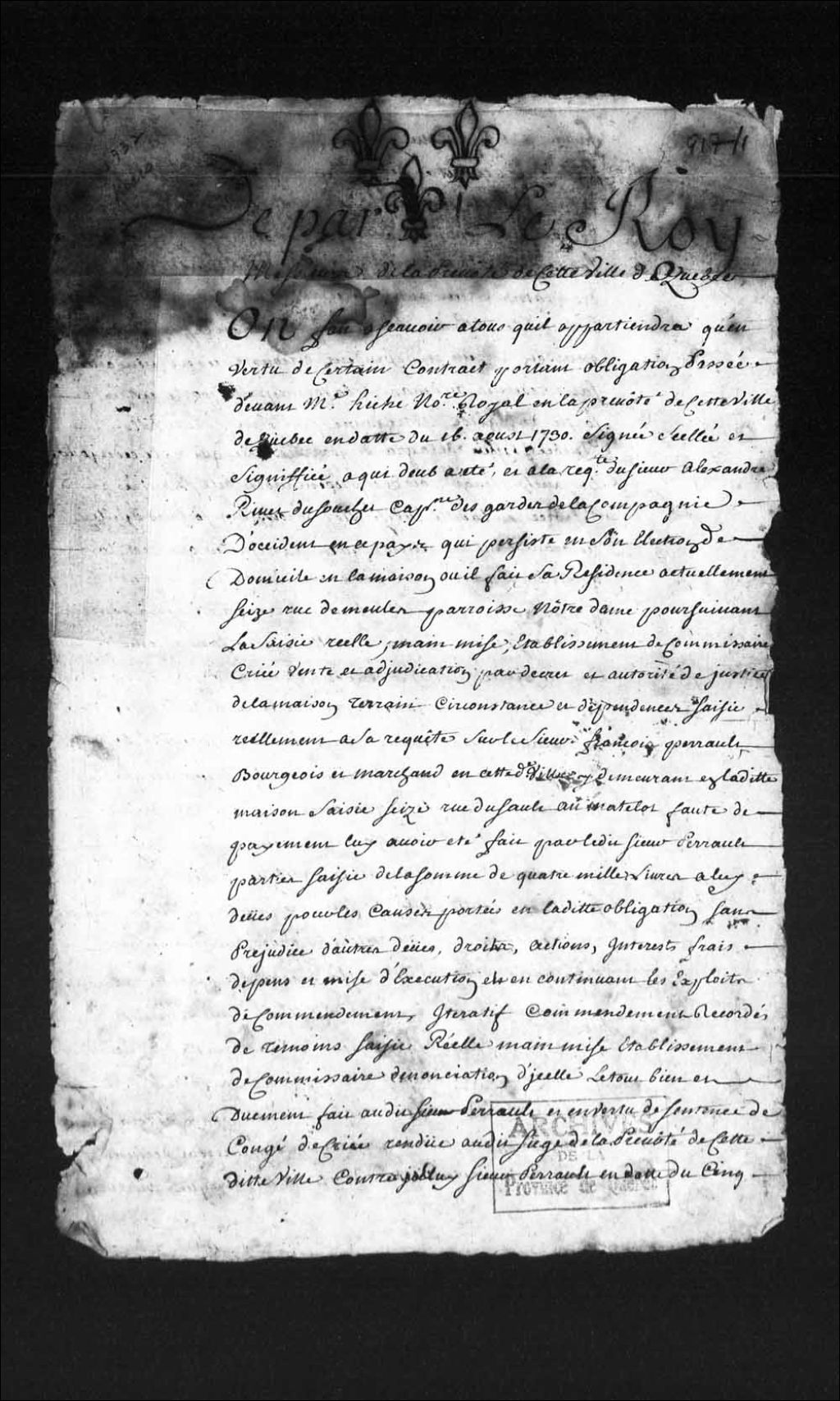 Instance entre Alexandre Rivet DuSouchet, capitaine des gardes de la Compagnie d'Occident en ce pays, et François Perrault (Perrot), bourgeois et marchand de Québec, au sujet de la saisie, vente et adjudication par décret d'une maison et terrain appartenant au sieur Perrault, en vertu du non-respect des conventions d'un contrat portant obligation, passé devant maître Hiché, notaire royal en la Prévôté de Québec, en date du 16 août 1730
