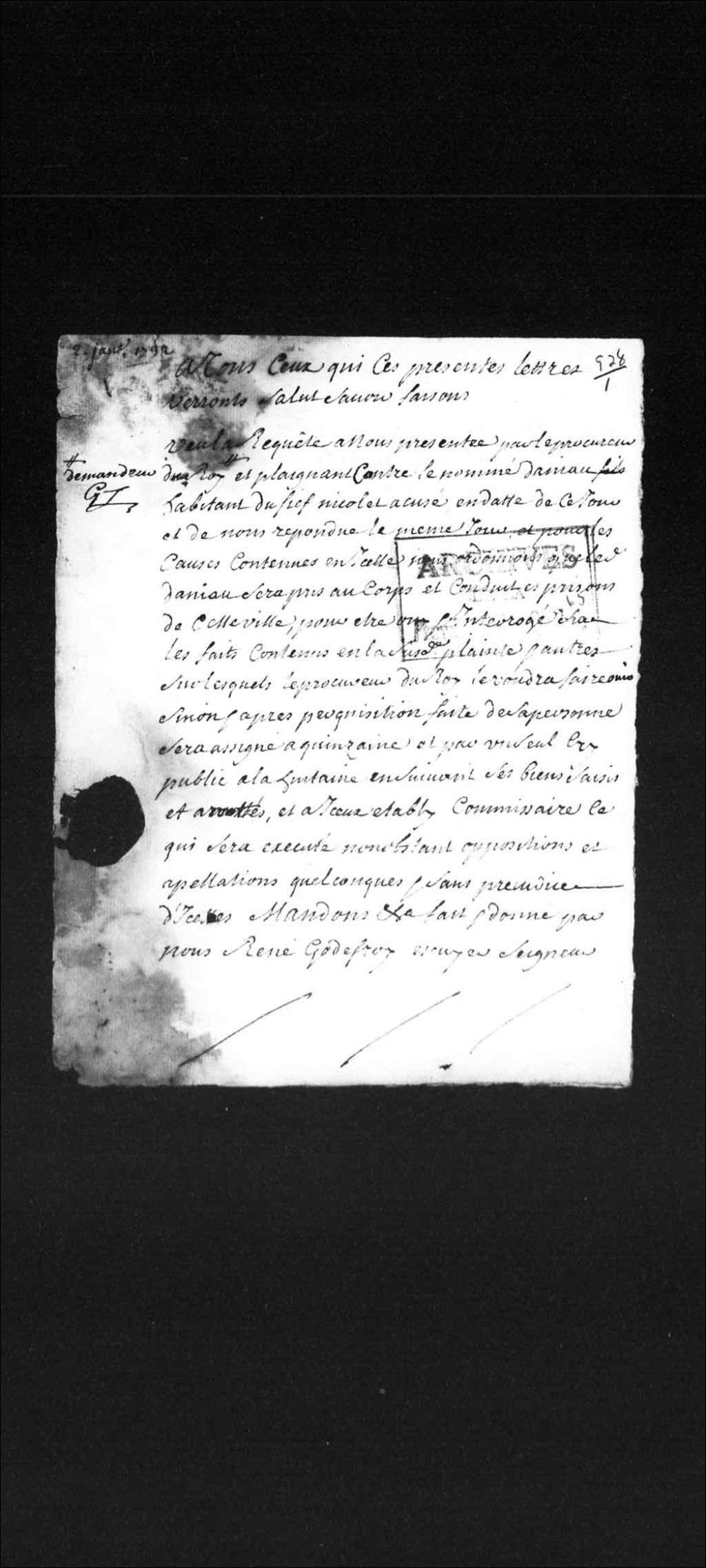 - Ce dosssier en matières criminelles provient de la Juridiction royale des Trois-Rivières et du Conseil supérieur de Québec. Il comprend des ordonnances du lieutenant général au siège de la Juridiction royale des Trois-Rivières; une requête du procureur du Roi pour que lui soit donné acte de sa plainte contre Jacques Daniau; un décret de prise de corps de l'accusé; le procès-verbal de prise de corps de l'accusé; une sentence rendue en la Juridiction royale des Trois-Rivières, suivie de la relaxation de l'accusé sous conditions de se présenter aux assignations à lui données; des exploits d'assignation et de signification; l'information des témoins; le récolement des témoins dans leurs dépositions et la confrontation de l'accusé avec les témoins; les interrogatoires de l'accusé; les requêtes du procureur du Roi; le procès-verbal de l'écrou de l'accusé; l'interrogatoire de l'accusé devant le Conseil supérieur de Québec; des arrêts du Conseil supérieur de Québec pour l'assignation et le récolement des témoins; un arrêt du Conseil faisant droit de l'appel du procureur du Roi; l'information par addition; le récolement des témoins dans leur déposition; la confrontation des témoins avec l'accusé; un défaut contre Léonard Dussault et Marguerite Daniau; le procès-verbal de l'assignation de Léonard Dussault; le récolement de Marguerite Daniau dans sa déposition; la confrontation de Marguerite Daniau avec l'accusé; les conclusions du procureur du Roi. Ce dossier contient les interrogatoires ou les dépositions des personnes suivantes : Antoine Simard, habitant de Nicolet, capitaine des milices de Nicolet, demeurant en la paroisse Saint-Jean-Baptiste, âgé de 48 ans; Jean-Baptiste Terrien, habitant de Nicolet, paroisse Saint-Jean-Baptiste, âgé de 50 ans; Jean-Baptiste Laspron (Lampron) dit Desfossés, habitant de Nicolet, paroisse Saint-Jean-Baptiste, âgé de 60 ans; Michel Jutras dit Desrosiers, lieutenant des milices de Nicolet, demeurant audit lieu de Nicolet, âgé de 40 ans; Marie-Josèphe Godefroy, demeurant à Nicolet, âgée de 49 ans; Marie-Jeanne Masto (Baston), demeurant à Nicolet, âgée de 29 ans; Marguerite Banliac (Banliard), demeurant à Nicolet, âgée de 50 ans; Marie-Jeanne Robert, femme de Léonard Dufault dit Lamarche, habitant de Nicolet, âgée de 21 ans; Jacques Robert dit Breton, habitant du fief Nicolet, âgé de 17 ans, filleul de Jacques Daniau; Marguerite Daniau, femme d'André Robert dit Breton, habitant de la seigneurie de Nicolet, âgé de 42 ans