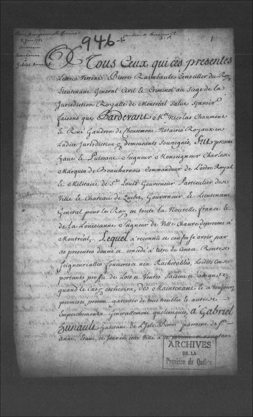 - Acte de concession d'une terre de trois arpents située dans la seigneurie de Villechauve, du côté du domaine, par Monseigneur Charles marquis de Beauharnois, commandeur de l'ordre royal et militaire de Saint-Louis, gouverneur particulier de la ville et du château de Québec, gouverneur et lieutenant général pour le Roi en toute la Nouvelle-France et Louisiane, et seigneur de Villechauve; à Gabriel Hunault, habitant de l'île Perrot, paroisse de Sainte-Anne