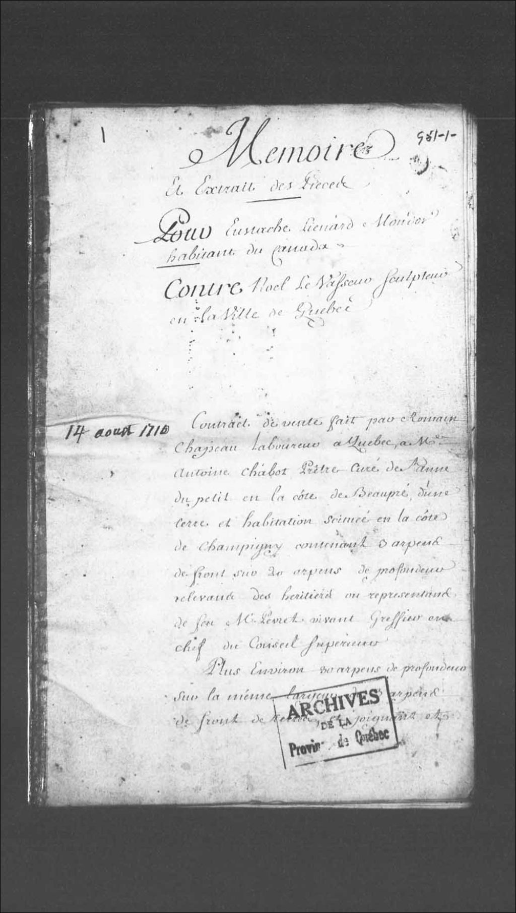 - Instance entre Eustache Liénard dit Mondor, habitant de la côte de Saint-François-Xavier du Cap-Rouge, et Noël Levasseur, sculpteur de Québec, faisant pour lui que pour ses cohéritiers en la succession de Romain Chapeau, laboureur demeurant en l'Hôtel-Dieu de Québec, relativement au contrat de vente d'une terre et habitation sises en la côte et seigneurie de Champigny