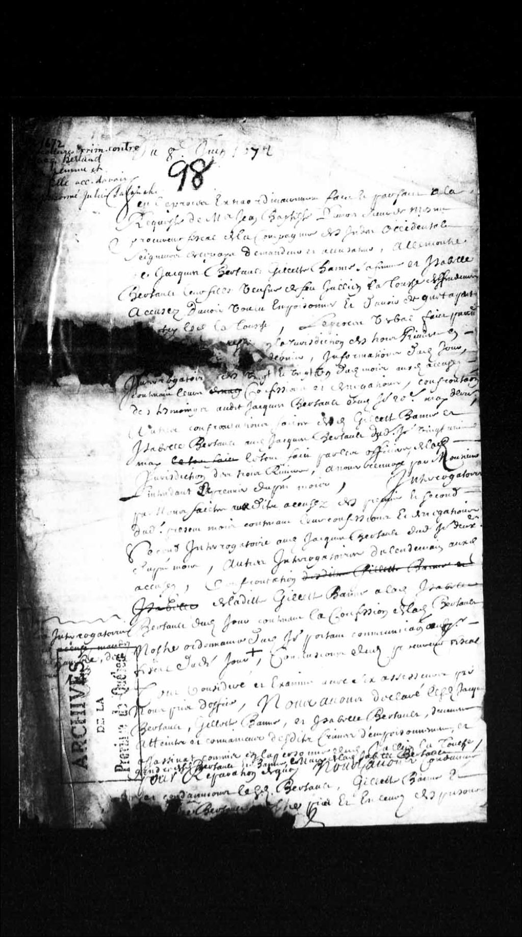 Sentence prononcée par le lieutenant civil et criminel de Québec (Prévôté de Québec) contre Jacques Bertault et Gillette Banne, sa femme, et leur fille Isabelle Bertault, veuve de Julien de Latouche, accusés d'avoir empoisonné ledit Latouche, 8 juin 1672, Archives nationales à Québec, Collection Pièces judiciaires et notariales, (03Q,TL5,D98).