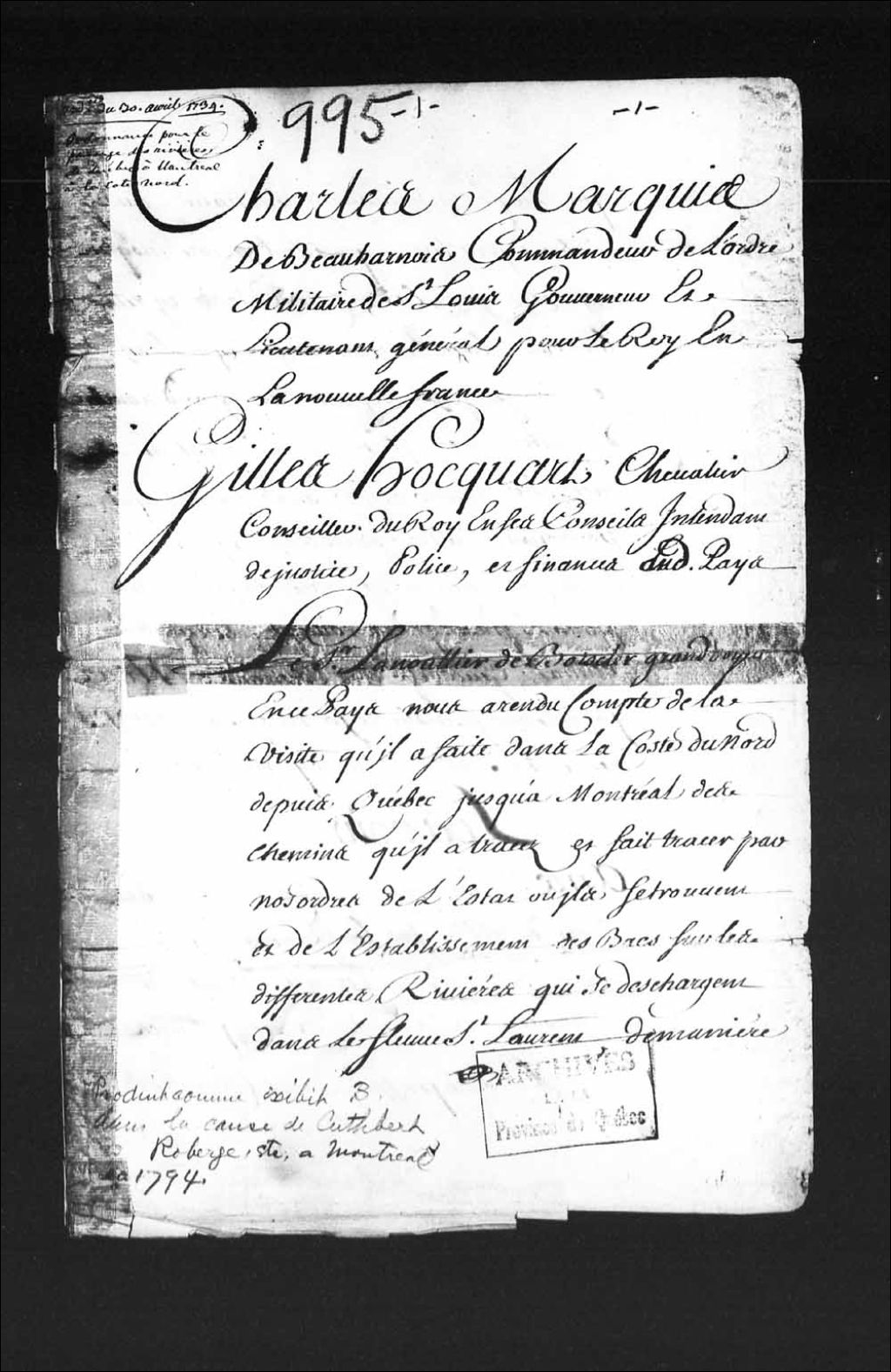 Ordonnance de Messieurs Charles Marquis de Beauharnois, commandeur de l'ordre militaire de Saint-Louis, gouverneur et lieutenant général pour le Roi en la Nouvelle-France; et Gilles Hocquart, chevalier, conseiller du Roi en ses conseils, intendant de justice, police et finances de la Nouvelle-France; fixant le prix que les passeurs des rivières, de Québec à Montréal, auront le droit d'exiger pour transporter les voyageurs d'une rive à l'autre, 30 avril 1734, Archives nationales à Québec, Collection Pièces judiciaires et notariales, (03Q,TL5,D995).
