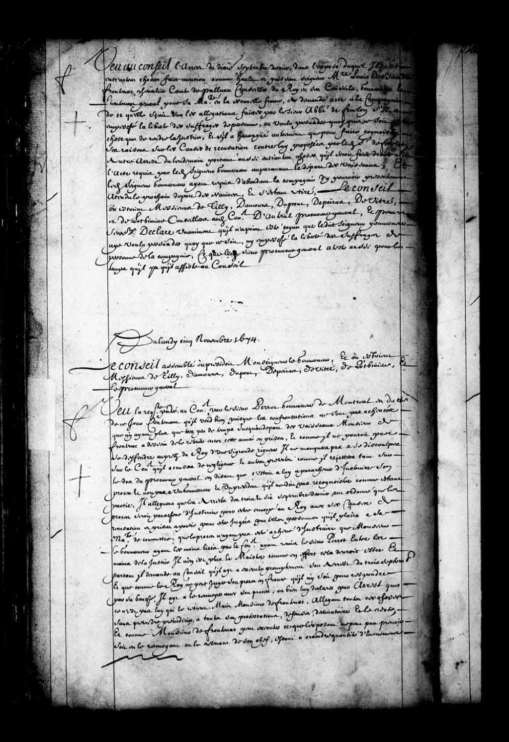 - Transcription du texte avec orthographe modernisée : «Vu au Conseil l'arrêt du dixième septembre dernier, dans l'exposé duquel il est entre autres choses faits mention comme haut et puissant seigneur messire Louis de Buade Frontenac chevalier comte de Palluau conseiller du Roi en ses Conseils, gouverneur et lieutenant général pour sa Majesté en la Nouvelle-France, a demandé acte à la compagnie de ce qu'elle sait sur les allégations faites par le sieur abbé de Fenelon, s'il a empêché la liberté des suffrages de personne, ou voulu persuader quoique ce soit autre chose que de rendre la justice, et s'il a harangué autrement que pour faire connaître ses raisons sur les causes de récusations contre lui proposées par ledit sieur de Fenelon; autre arrêt du lendemain portant aussi entre autres choses qu'il serait fait droit sur l'acte requis par ledit seigneur gouverneur auparavant le départ des vaisseaux; et ledit seigneur gouverneur ayant requis d'abondant la compagnie d'y pourvoir présentement attendu le prochain départ des navires, et s'étant retiré, le Conseil où étaient Messieurs de Tilly, Damours, Dupont, Depeiras, et de Vitré et de Lotbinière conseillers audit Conseil, d'Auteuil procureur général, et Peuvret secrétaire déclare unanimement qu'il n'a point été connu que ledit seigneur gouverneur aie voulu persuader quoique ce soit, ni empêché la liberté des suffrages de personne de la compagnie, ce que ledit sieur procureur général atteste aussi pour le temps qu'il y a qu'il assiste au Conseil.»