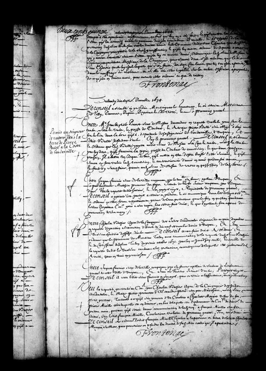 - Transcription du texte avec orthographe modernisée : «Du lundi dix-septième décembre 1674. Le Conseil assemblé où présidait Monseigneur le gouverneur, et où étaient Messieurs de Tilly, Damours, Dupont, Depeiras, et de Vitré, et le procureur général. Permis au seigneur de rentrer dans la terre de Pierre Bulté, à la côte de Gaudarville. Entre maître Jean-Baptiste PEUVRET sieur de Mesnu demandeur en requête verbale pour cens et rentes, lots et ventes, et grosse de contrat, et à ce que Pierre Bulté soit obligé à tenir feu et lieu dans la terre qu'il a dépendante de sa seigneurie de Gaudarville d'une part; et ledit Bulté défendeur d'autre. Ouï le procureur général, le Conseil a ordonné et ordonne que ledit Bulté payera audit sieur de Mesnu les cens et rentes, lots et ventes par lui dus, qu'il fournira la copie grosse du contrat de concession, et que dans pâques prochain il abattra un arpent de bois, qu'il mettra en état d'être brûlé l'été [...]