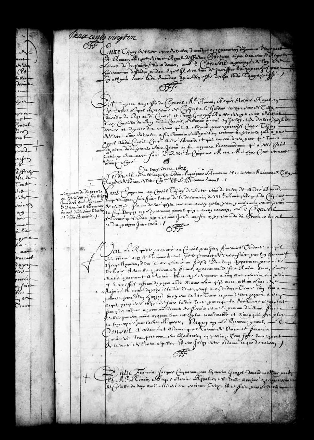 - Transcription du texte avec orthographe modernisée : «Vu la requête présentée au Conseil par Jean fauconnet tendante à ce qu'il soit ordonné avec procureur général que le contrat de vente faite par lui fauconnet à Jean Magneron d'une terre située au fief de Dombourg appartenant pour moitié à Marie Attanville à présent sa femme, auparavant veuve de Robert Senat, l'autre moitié appartenant à Antoine Senat âgé de quatre à cinq ans, sortira son plein et entier effet, offrant de payer audit mineur lors qu'il aura atteint l'âge de majorité la moitié du prix de ladite vente, sauf à en déduire trente-cinq livres pour sa part d'un hangard bâti sur ladite terre et pour dettes payées à son acquit, ayant été obligé de faire ladite vente par ce que ladite terre se gâtait faute de culture ne pouvant trouver de fermier et ne la pouvant d'ailleurs faire valoir par ses mains en ayant une autre plus considérable et ainsi qu'il est plus au long exposé par ladite requête; sur quoi ouï le procureur général, le Conseil a ordonné et ordonne que Antoine de Serre et François Garnier se transporteront sur l'habitation en question, pour faire leur rapport de la vérité de l'état d'icelle, et sur icelui être ordonné ce que de raison. FF.»