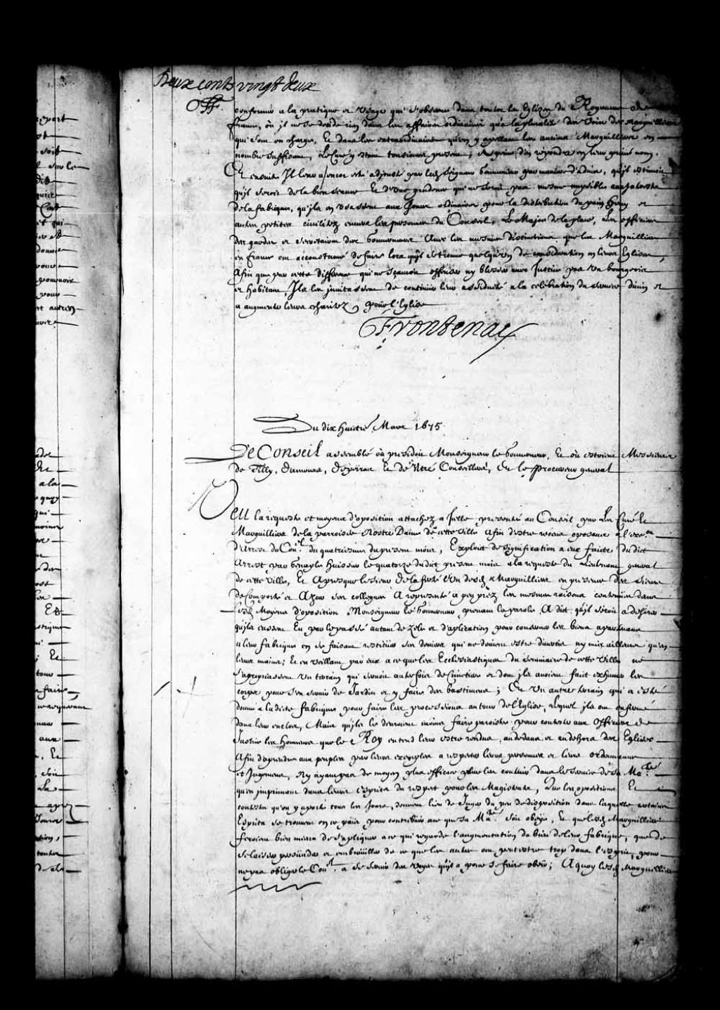 - Transcription du texte avec orthographe modernisée : «Du dix-huitième mars 1675. Le Conseil assemblé où présidait Monseigneur le gouverneur, et où étaient Messieurs de Tilly, Damours, Depeiras et de Vitré conseiller et le procureur général. Vu la requête et moyens d'opposition attachés à icelle présentée au Conseil par les curé et marguilliers de la paroisse Notre-Dame de cette ville afin d'être reçus opposant à l'exécution d'arrêt du Conseil du quatrième du présent mois, exploit de signification à eux faite dudit arrêt par Genaple huissier le quatorze dudit présent mois à la requête du lieutenant général de cette ville, et après que le sieur de LaFerté l'un desdits marguilliers en présence des sieurs de Comporté et Azeur ses collègues a représenté à peu près les mêmes raisons contenues dans lesdits moyens d'opposition Monseigneur le gouverneur prenant la parole, a dit qu'il serait à désirer qu'ils eussent eu par le passé autant de zèle [...]