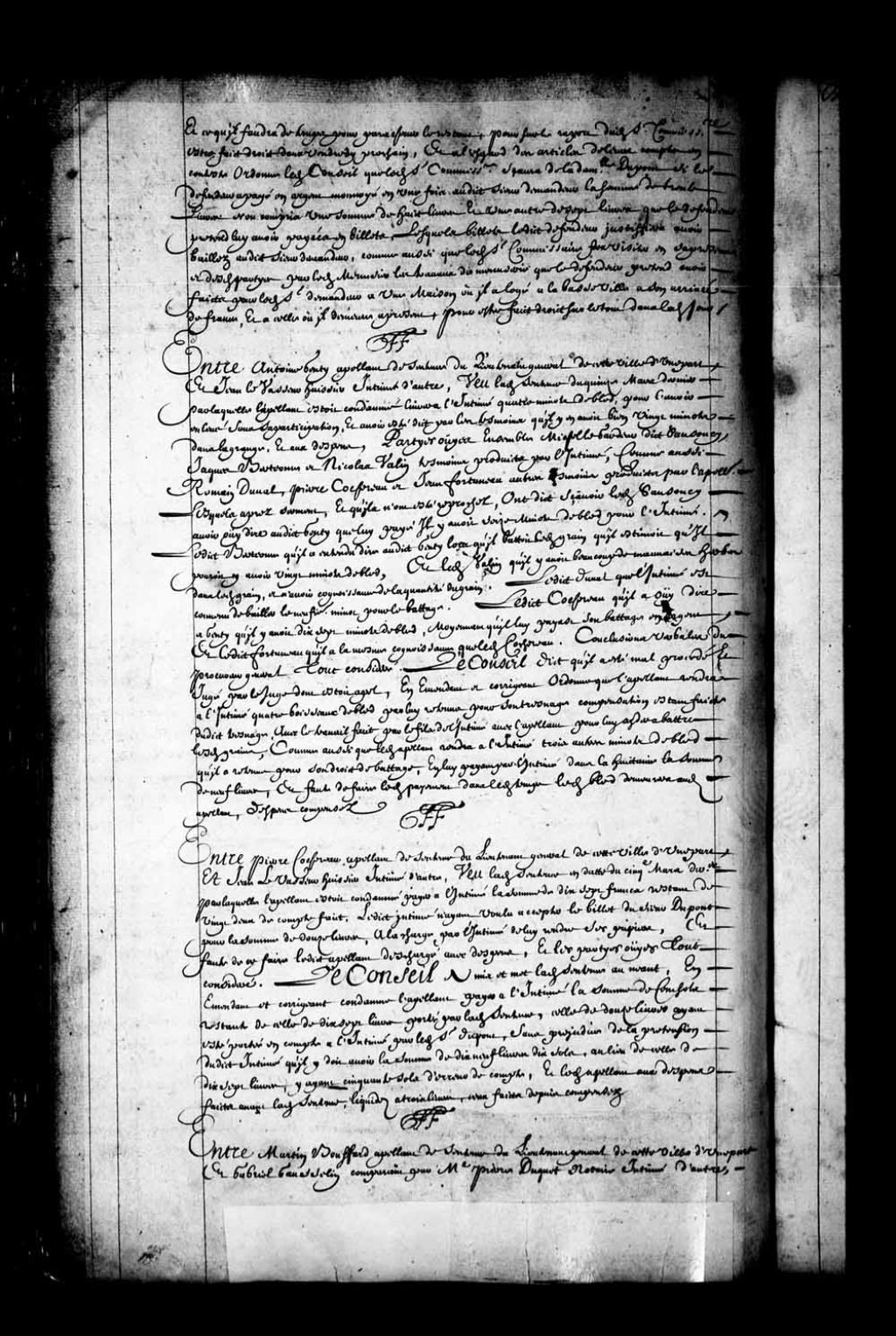 - Transcription du texte avec orthographe modernisée : «Entre Antoine GENTY appelant de sentence du lieutenant général de cette ville d'une part, et Jean LEVASSEUR huissier intimé d'autre; vu ladite sentence du quinze mars dernier par laquelle l'appelant était condamné livrer à l'intimé quatre minots de blé, pour l'avoir enlevé sans sa participation, et avoir été dit par les témoins qu'il y en avait bien vingt minots dans la grange, et aux dépens. Parties ouïes ensemble Michel LeGardeur dit Sansoucy, Jacques Berteome et Nicolas Valin, témoins produits par l'intimé, comme aussi Romain Duval, Pierre Cochereau et Jean Fortuneau autres témoins produits par l'appelant, lesquels après serment, et qu'ils n'ont été reprochés, ont dit savoir, ledit Sansoucy avoir ouï-dire audit Genty que lui payé, il y avait seize minots de blé pour l'intimé. Ledit Berteome qu'il a entendu dire audit Genty lorsqu'il battait ledit grain qu'il estimait qu'il pourrait y avoir vingt minots de blé; et ledit Valin qu'il y avait beaucoup de mauvaises herbes dans ledit grain, et n'avoir connaissance de la quantité du grain. Ledit Duval que l'intimé est convenu de bailler le neuvième minot pour le battage. Ledit Cochereau qu'il a ouï-dire à Genty qu'il y avait dix-sept minots de blé, moyennant qu'il lui payât son battage en argent; et ledit Fortuneau qu'il a la même connaissance que ledit Cochereau. Conclusions verbales du procureur général, tout considéré. Le Conseil dit qu'il a été mal procédé et jugé par le juge dont était appel, en émendant et corrigeant ordonne que l'appelant rendra à l'intimé quatre boisseaux de blé par lui retenus pour son traînage compensation étant faite dudit traînage, avec le travail fait par le fils de l'intimé avec l'appelant pour lui aider à battre lesdits grains; comme aussi que ledit appelant rendra à l'intimé trois autres minots de blé qu'il a retenus pour son droit de battage, en lui payant par l'intimé dans la huitaine la somme de neuf livres, et faute de faire ledit payement dans ledit temps ledit blé demeurera audit appelants dépens compensés. FF.»