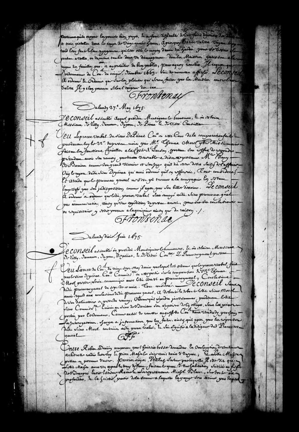 Transcription du texte avec orthographe modernisée : «Du lundi 27e mai 1675. Le Conseil assemblé auquel présidait Monseigneur le gouverneur, et où étaient Messieurs de Tilly, Damours, Dupont, Depeiras et de Vitré, conseillers. Vu le procès-verbal du sieur Depeiras conseiller en cette Cour de la comparution faite par-devant lui le 22e du présent mois par messire Thomas Morel prêtre missionnaire faisant les fonctions curiales à la côte de Lauson, portant son refus de répondre, prétendant avoir son renvoi par-devant vénérable et discrète personne messire Henri de Bernières comme son grand vicaire et son juge qu'il dit être déjà saisi de l'affaire; ouï le rapport dudit sieur Depeiras tout considéré. Et attendu que le procureur général ne s'est pu trouver à la compagnie en étant empêché par son indisposition comme il appert par son billet d'exoine. Le Conseil a ordonné et ordonne que ledit procès-verbal sera envoyé audit sieur procureur général par communication ainsi qu'une expédition du présent arrêt, pour sur ses conclusions ou réquisitoire y être pourvu à la quinzaine ainsi que de raison. FRONTENAC.»