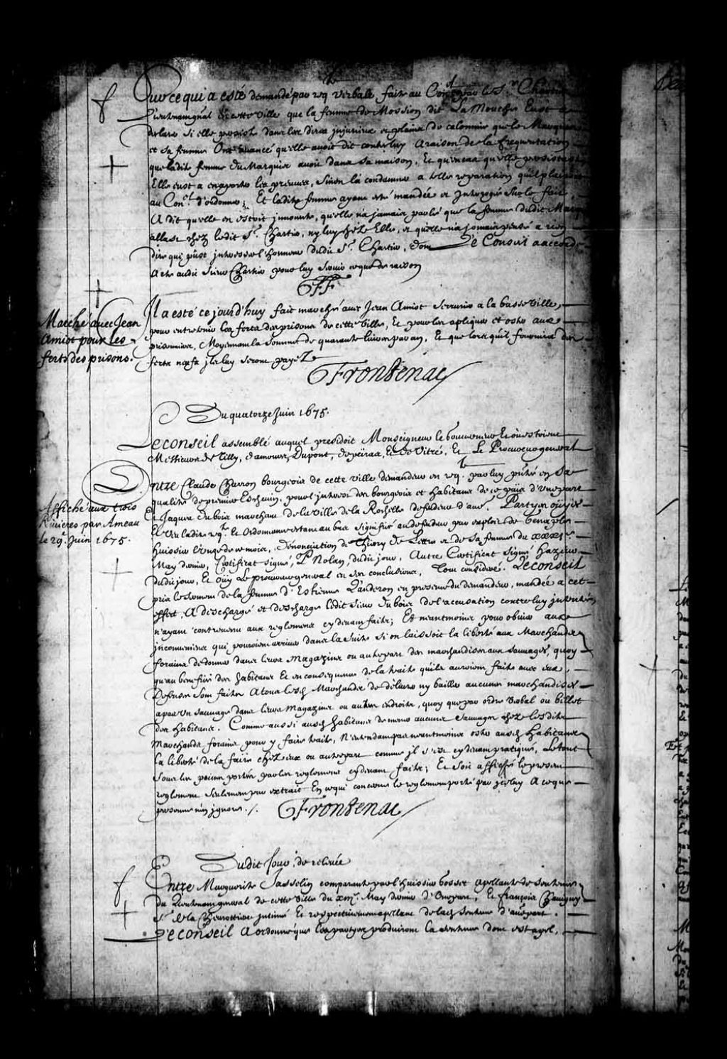 Arrêt accordant acte au sieur Chartier, contre la femme de Moussion dit Lamouche qui l'aurait calomnié et attaqué son honneur en disant que la femme du Marquis fréquentait sa maison et lui, la sienne, 10 juin 1675, Archives nationales à Québec, Fonds Conseil souverain, (03Q,TP1,S28,P1101).