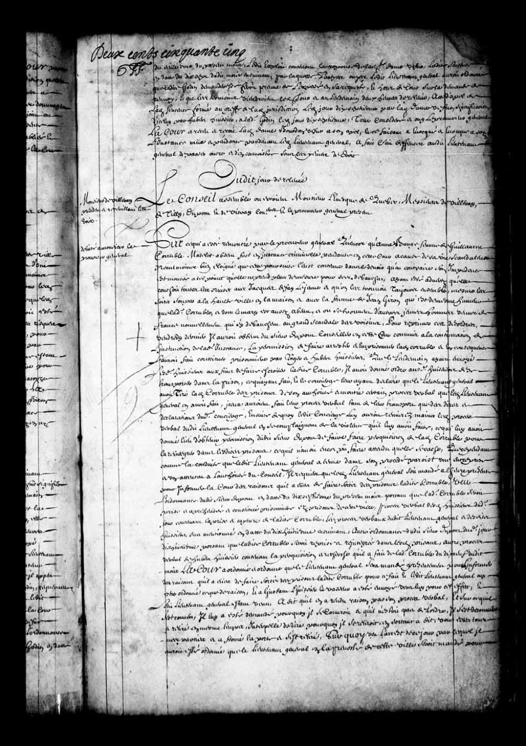 Transcription du texte avec orthographe modernisée : «Dudit jour de relevée. Monsieur de Villeray présidant et recueillant les voix. Le Conseil assemblé où étaient Monsieur l'évêque de Québec Messieurs de Villeray, de Tilly, Dupont et de Vitray conseillers et le procureur général présent. Délivré à Monsieur le procureur général. Sur ce qui a été remontré par le procureur général qu'encore que Anne Baugé femme de Guillaume Corruble matelot absent, fut en instance criminelle pendante en cette Cour à cause de sa vie scandaleuse néanmoins bien éloigné que cette poursuite l'eût contenue dans le devoir, qu'au contraire son impudence est montée à tel point qu'elle ne prend plus de mesure pour ses débauches, ayant été averti qu'elle couchait toutes les nuits avec Jacques de Fay Lejeune et qu'on les trouvait toujours ensemble, même les soirs souper à la haute-ville en la maison et avec la femme de Jean Giron qui est de même humeur que ladite Corruble, et dont le mari est aussi absent, et ou se trouvent d'autres jeunes hommes venus de France nouvellement, qui s'y débauchent au grand scandale des voisins; pour réprimer ces désordres, vendredi dernier il aurait obtenu du sieur Dupont conseiller en cette cour commis à la continuation de l'instruction de ladite instance, la permission de faire arrêter et emprisonner ladite Corruble et en conséquence l'aurait fait constituer prisonnière par Roger et Hubert huissiers; que le lendemain ayant envoyé lesdits huissiers aux fins de faire écrouer ladite Corruble, il avait donné ordre auxdits huissiers de se transporter dans la prison, ce qu'ayant fait, et le concierge leur ayant déclaré que le lieutenant général avait tiré ladite Corruble des prisons de son autorité, et montré certain procès-verbal que ledit lieutenant général en avait fait, iceux auraient fait leur procès-verbal tant de leur transport que des dires et déclarations dudit concierge, ensuite de quoi ledit concierge lui aurait remis en les mains ledit procès-verbal dudit lieutenant général en se complaignants de la violence qu'il lui avait donné lieu d'obtenir permission dudit sieur Dupont de faire faire perquisition de ladite Corruble pour la réintégrer dans lesdites prisons, ce qu'il n'avait encore pu faire attendu qu'elle se cache; que cependant comme la conduite que ledit lieutenant général a tenue dans son procédé paraît une entreprise et un attentat à l'autorité du Conseil, il requiert que ledit lieutenant général soit mandé à l'heure présente pour informer la Cour des raisons qu'il a eues de faire sortir des prisons ladite Corruble; vu l'ordonnance dudit sieur Dupont en date du dix-septième du présent mois portant que ladite Corruble serait prise et appréhendée et constituée prisonnière des prisons de cette ville; procès-verbal desdits huissiers dudit jour contenant la prise et capture de ladite Corruble, les procès-verbaux dudit lieutenant général et desdits huissiers sus-mentionné en date du dix-huitième ensuivant; autre ordonnance dudit sieur Dupont dudit jour dix-huitième portant que ladite Corruble serait reprise et réintégrée dans lesdites prisons; autre procès-verbal de Hubert huissier contenant la perquisition et recherche qu'il a fait de ladite Corruble, du dix-neuf dudit mois la Cour a ordonné et ordonne que le lieutenant général sera mandé présentement pour l'informer des raisons qu'il a eues de faire sortir des prisons ladite Corruble pour ce fait et ledit lieutenant général ouï être ordonné ce que de raison. Et à l'instant l'huissier Levasseur a été envoyé vers lui pour cet effet, et ledit lieutenant général étant venu, a dit qu'il a rendu raison par son procès-verbal; Et sur ce qu'il s'est couvert, il lui a été demandé pourquoi il se couvrait et qu'il n'était pas de l'ordre, il s'est découvert et retiré en même temps; interpellé de dire pourquoi il se retirait, en sortant a dit, vous êtes tous mes parties et a fermé la porte et s'est retiré. Sur quoi vu l'arrêt de ce jour par lequel il aurait été ordonné que le lieutenant général en la prévôté de cette ville serait mandé pour informer la Cour des raisons qu'il a eues de faire sortir des prisons Anne Bauge femme de Guillaume Corruble, et icelui lieutenant général s'étant en conséquence présenté et refusé d'y satisfaire, la Cour ce requérant le procureur général a ordonné et ordonne que ledit lieutenant général sera assigné à comparaître jeudi prochain, huit heures du matin en la chambre du Conseil pour répondre aux fins dudit arrêt.»