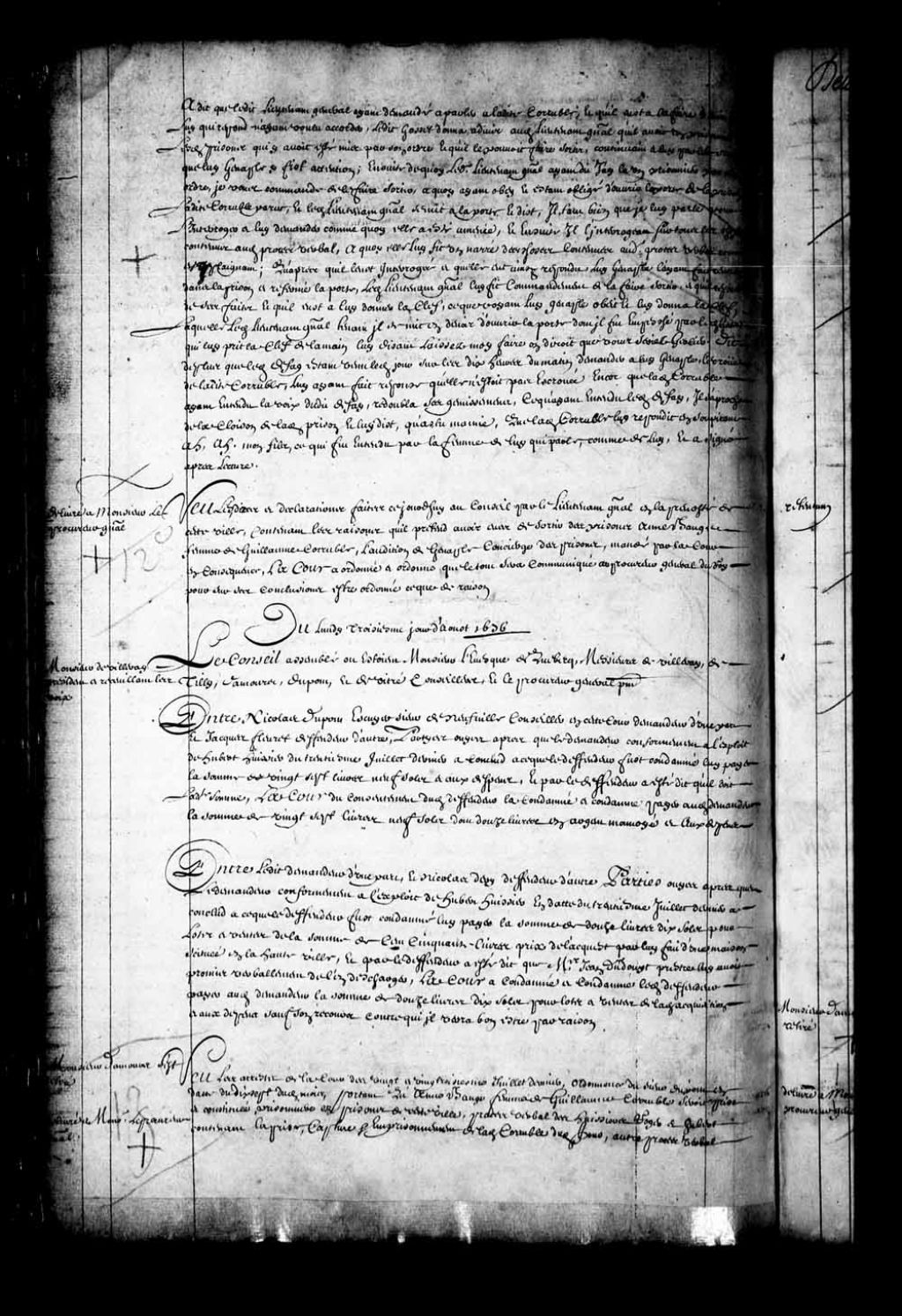 - Transcription du texte avec orthographe modernisée : «Du lundi troisième jour d'août 1676. Monsieur de Villeray présidant et recueillant les voix. Le Conseil assemblé où étaient Monsieur l'évêque de Québec, Messieurs de Villeray, de Tilly, Damours, Dupont et de Vitray conseillers, et le procureur général présent. Entre Nicolas DUPONT écuyer sieur de Neuville conseiller en cette Cour demandeur d'une part; et Jacques FLEURET défendeur d'autre. Parties ouïes après que le demandeur conformément à l'exploit de Hubert, huissier, du trentième juillet dernier a conclu à ce que le défendeur fut condamné lui payer la somme de vingt-sept livres neuf sols et aux dépens, et par le défendeur a été dit qu'il doit ladite somme, la Cour du consentement dudit défendeur l'a condamné et condamne payer audit demandeur la somme vingt-sept livres neuf sols dont douze livres en argent monnayé et aux dépens.»