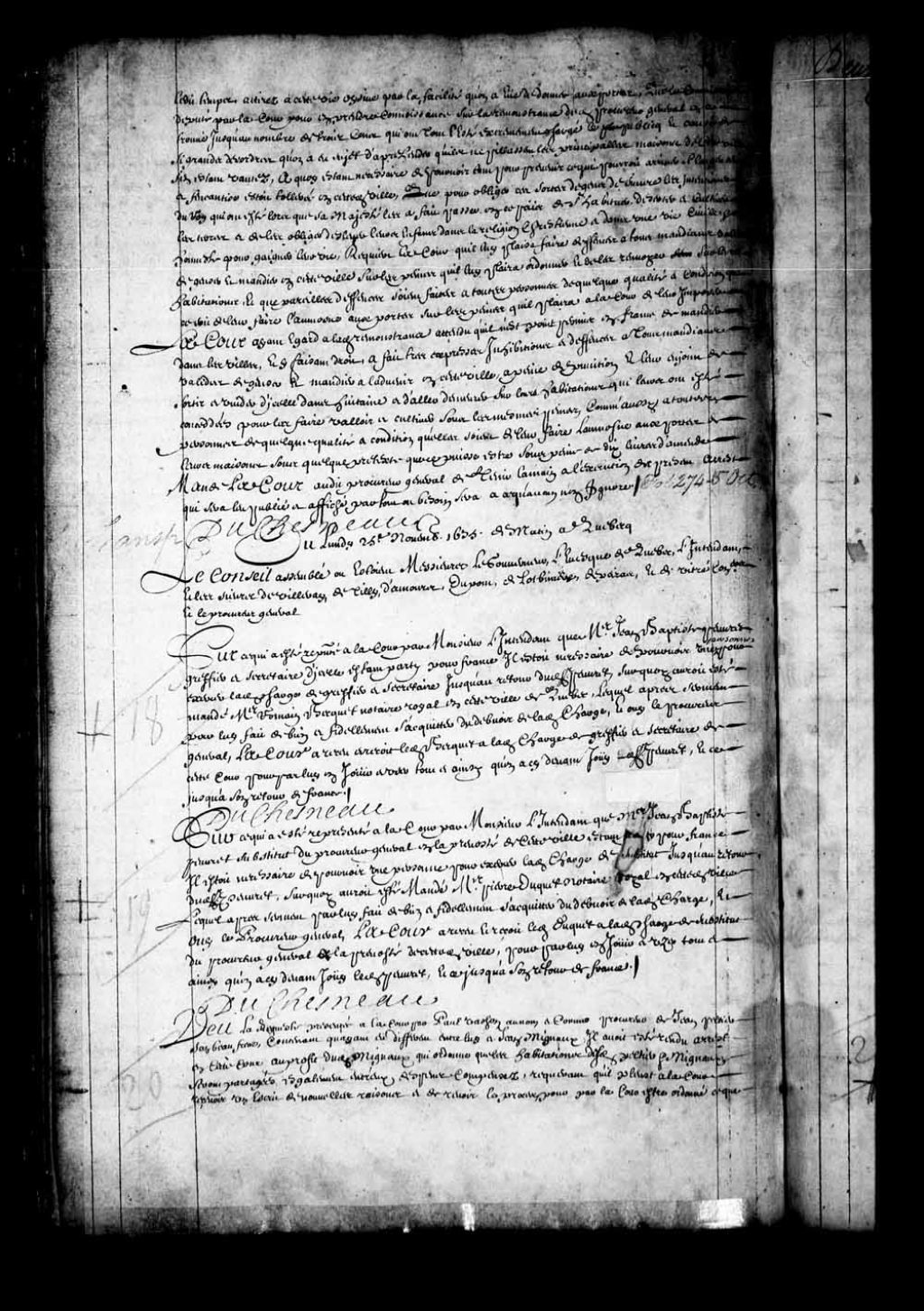Transcription du texte avec orthographe modernisée : «Sur ce qui a été représenté à la Cour par Monsieur l'intendant que maître Jean-Baptiste Peuvret substitut du procureur général en la prévôté de cette ville, étant parti pour France, il était nécessaire de pourvoir une personne pour exercer ladite charge de substitut jusqu'au retour dudit sieur Peuvret, sur quoi aurait été mandé maître Pierre Duquet notaire royal en cette dite ville, lequel après serment par lui fait de bien et fidèlement s'acquitter du devoir de ladite charge, et ouï le procureur général, la Cour a reçu et reçoit ledit Duquet à ladite charge de substitut du procureur général à la prévôté de cette dite ville, pour par lui en jouir et user tout et ainsi qu'en a ci-devant joui ledit Peuvret, et ce jusqu'à son retour de France. DUCHESNEAU.»
