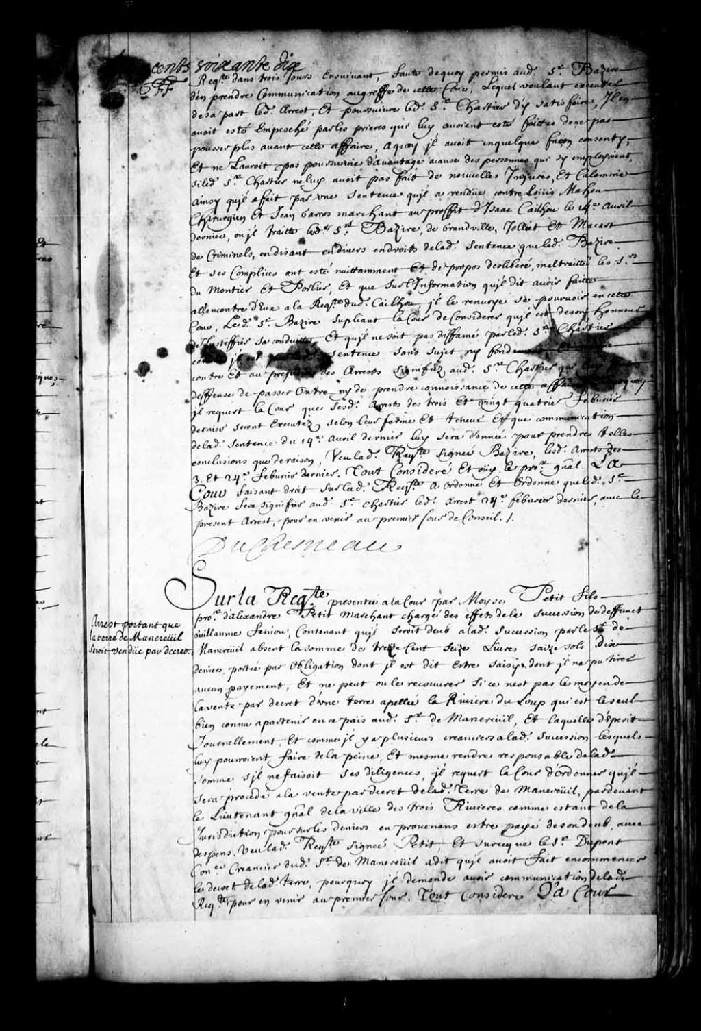 - Transcription du texte avec orthographe modernisée : «Du lundi onzième jour de mai 1676 du matin. Le Conseil assemblé où étaient Monsieur l'intendant, les sieurs de Villeray, de Tilly, Damours, Dupont, de Lotbinière, de Peyras et de Vitray conseillers, le procureur général présent. Règlements généraux pour la police. Vu par la Cour son arrêt du quatorzième janvier dernier, portant qu'il serait travaillé aux règlements de police conformément aux ordres données par le Roi au sieur Duchesneau intendant de la justice, police et finances de ce pays, contenues dans sa commission signée Louis, et plus bas Colbert, et scellée en queue de grand sceau de cire jaune donnée au camp de Luting le cinquième juin mille six cent soixante-quinze, registrée en cette Cour le seizième septembre ensuivant; ouï le procureur ¿ Affiché aux Trois-Rivières par Ameau, le 2e février 1686 ¿ général en ses conclusions, la Cour, après s'être fait représenter les [...]