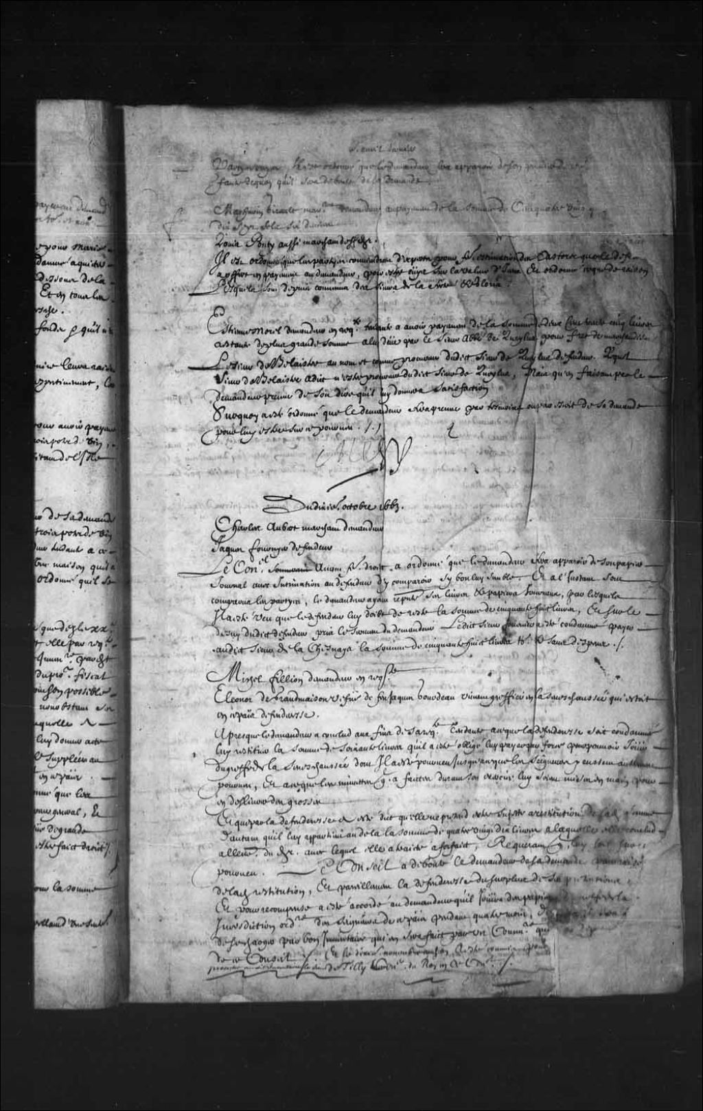 - Transcription du texte avec orthographe modernisée : «Michel FILLION, demandeur en requête. Eléonore de GRANDMAISON veuve de feu Jacques Gourdeau vivant greffier en la sénéchaussée qui était en ce pays défenderesse. Après que le demandeur a conclu aux fins de sa requête tendante à se que la défenderesse soit condamnée lui restituer la somme de soixante livres qu'il a été obligé lui payer par force pour pouvoir jouir du greffe de la sénéchaussée dont il a été pourvu jusqu'à ce que les seigneurs y eussent autrement pourvu, et à ce que les minutes qu'il a faites durant son exercice lui soient mises en main pour en délivrer des grosses, et que par la défenderesse a été dit qu'elle ne prétend être sujette a restitution de ladite somme d'autant qu'il lui appartient au delà la somme de quatre-vingt-dix livres à laquelle elle conclu à l'encontre du demandeur avec lequel elle a traité à forfait, requérant qu'il lui soit sur ce pourvu. Le Conseil a débouté le demandeur de sa demande pour raison de ladite restitution, et pareillement la défenderesse du surplus de ses prétentions et pour récompense a été accordé au demandeur qu'il jouira des papiers du greffe de la juridiction ordinaire des seigneurs de ce pays pendant quatre mois, desquels il sera tenu de se charger par bon inventaire qui en sera fait par un commissaire qui sera député de ce Conseil. Et le dixième novembre audit an a été commis pour procéder audit inventaire le sieur de Tilly conseiller du Roi en ce Conseil.»