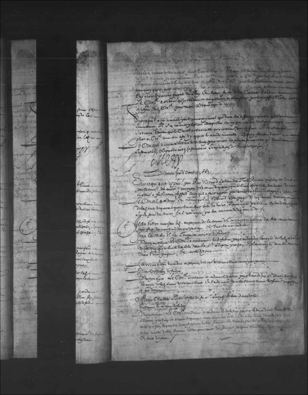 Arrêt ordonnant l'enregistrement au greffe du Conseil d'un contrat de don mutuel entre le sieur de Villeray et sa femme, passé devant Jean Gloria, notaire royal, 27 octobre 1663, Archives nationales à Québec, Fonds Conseil souverain, (03Q,TP1,S28,P1415).