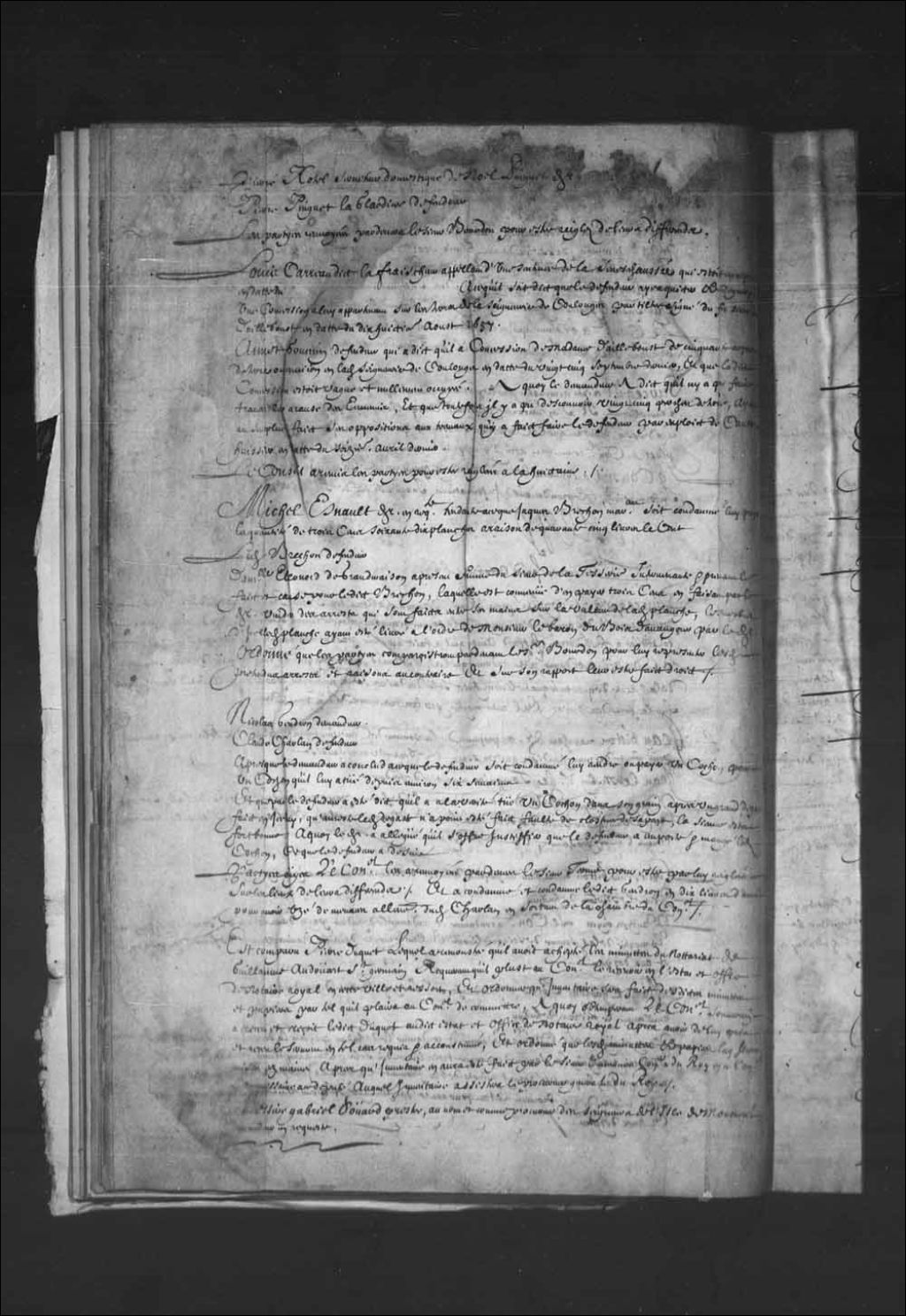 Transcription du texte avec orthographe modernisée : «Est comparu Pierre DUQUET lequel a remontré qu'il avait acheté les minutes du notariat de Guillaume Audouart Saint-Germain requérant qu'il plût au Conseil le recevoir en l'état et office de notaire royal en cette ville et ressort, et ordonner qu'inventaire sera fait desdites minutes et papiers par tel qu'il plaira au Conseil de commettre, à quoi obtempérant. Le Conseil souverain a reçu et reçoit ledit Duquet audit état et office de notaire royal après avoir de lui pris et reçu le serment en tel cas requis et accoutumé, et ordonné que lesdites minutes et papiers lui seront mis en les mains après qu'inventaire en aura été fait par le sieur Damours conseiller du Roi en ce Conseil commissaire à ce député auquel inventaire assistera le procureur général du Roi. »