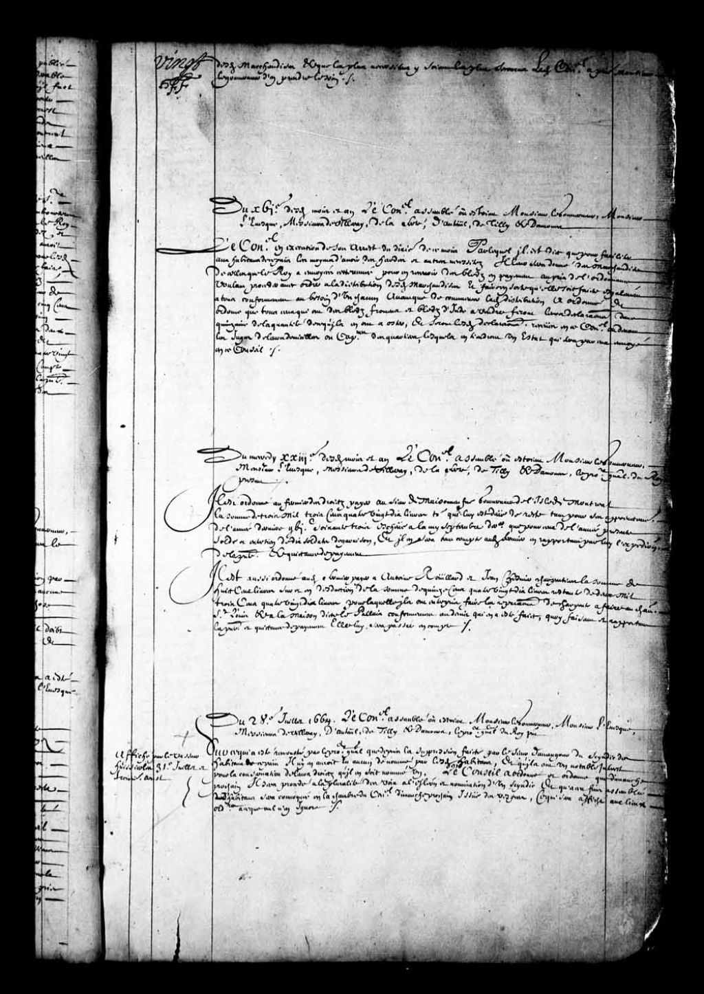 Transcription du texte avec orthographe modernisée : «Du mercredi 23e desdits mois et an. Le Conseil assemblé où étaient Monsieur le gouverneur, Monsieur l'évêque, Messieurs de Villeray, de LaFerté, de Tilly et Damours, le procureur général du Roi présent. Il est ordonné au fermier des droits payer au sieur de Maisonneuve gouverneur de l'île de Montréal la somme de trois mille trois cent quatre-vingt-dix livres tournois qui lui est due de reste tant pour ses appointements de l'année dernière mille six cent soixante-trois échue à la mi-septembre dernier que pour ceux de l'année présente solde et entretien de dix soldats de garnison, et il en sera tenu compte audit fermier en rapportant par lui l'expédition de la présente et quittance de payement.»