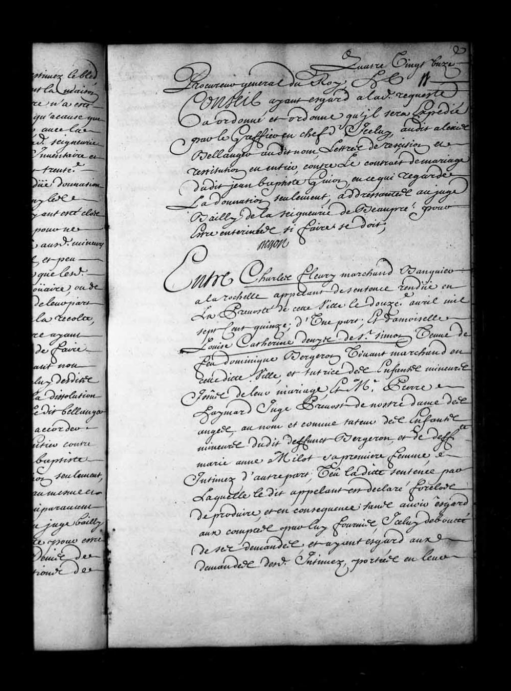 - Appellation mise à néant dans la cause de Charles Fleury, marchand banquier de Larochelle, et de demoiselle Louise-Catherine Denys de Saint-Simon, veuve de Dominique Bergeron, marchand à Québec, et tutrice des enfants mineurs issus de leur mariage, et Pierre Haimard, juge prévôt de Notre-Dame-des-Anges, au nom et comme tuteur des enfants mineurs du dit défunt Dominique Bergeron et de défunte Marie-Anne Milot, sa première femme