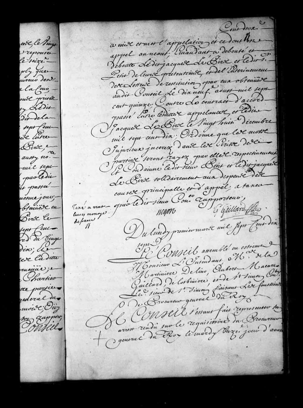 Ordre d'enregistrer, aux greffes des Juridictions de Trois-Rivières et de Montréal, l'arrêt du Conseil, du 11 août 1716, au sujet du bois de corde, en barques et en cajeux, pendant l'été et en traînes pendant l'hiver, de l'abandonnement des domestiques du service de leurs maîtres, et du prix que les bouchers voudraient fournir de la viande au public, 1er mars 1717, Archives nationales à Québec, Fonds Conseil souverain, (03Q,TP1,S28,P15013).